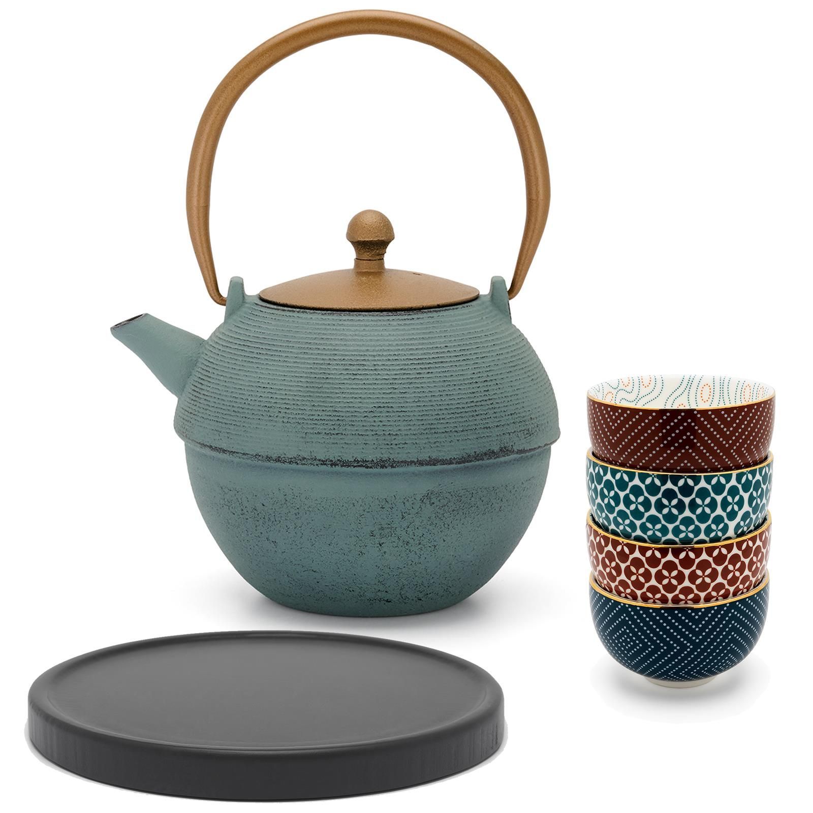 Bredemeijer Bredemeijer Asia Teekannen Set 1,2 L blau Gusseisen Holzuntersetzer & 4 Porzellan Bec