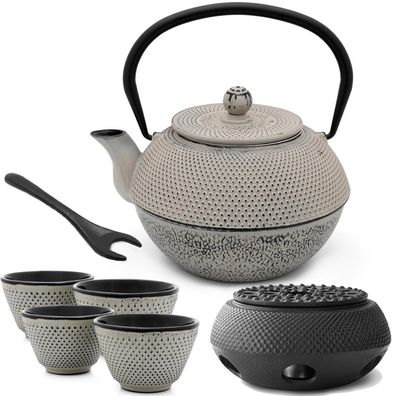 Bredemeijer Große Aisa Teekanne Gusseisen 1,1 L grau Teeset 4 Becher Stövchen & Decke