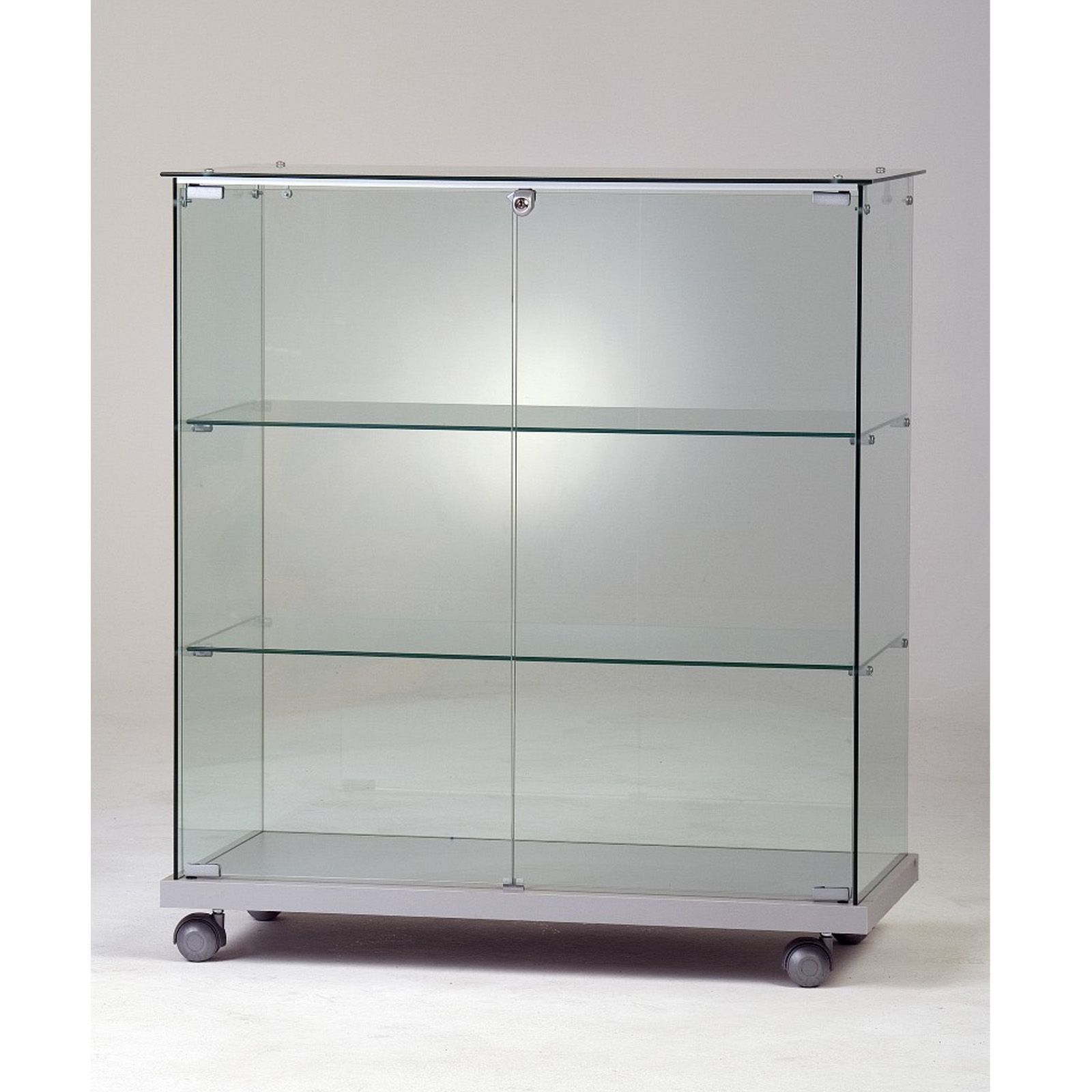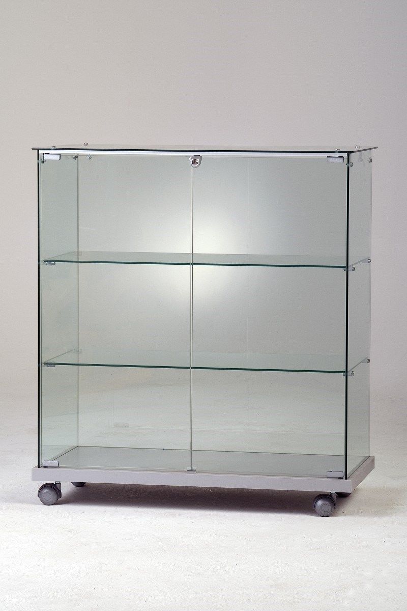 breite Vitrine Glas halbhoch Messe Messebau Verkaufstheke Schloss rollbar 80 cm