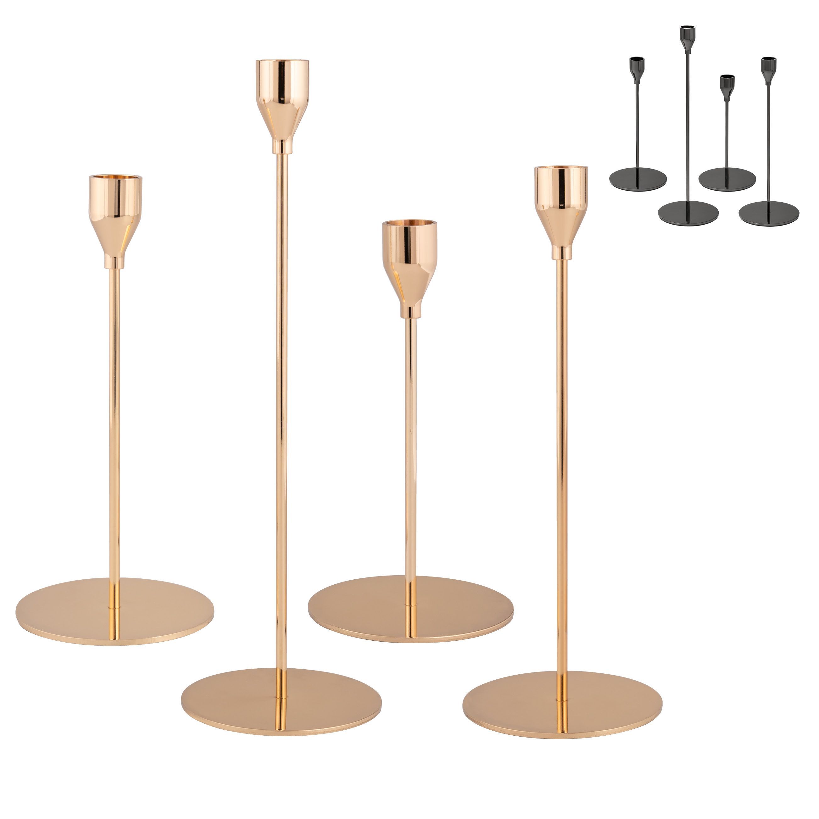 4er-Set Kerzenhalter, roségold in 4 unterschiedliche Größen; EVA-Pads schützen vor Kratzern; geeignet für Spitz-, Stab- oder Tafelkerzen (ca.2,2 mm Ø); Material: Aluminium und Stahl, EVA-Pads; Abmessungen: ca. 10 x 19 cm /10 x 22 cm /10 x 27 cm /10 x 32 cm (Ø /H)