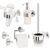 1x Toilettenpapierhalter, 1x WC-Garnitur, inkl. 1 Ersatzbürstenkopf, 1x Seifenspender, 1x Handtuchhaken, 1x Föhnhalter, Montageanleitung, Befestigungsmaterial