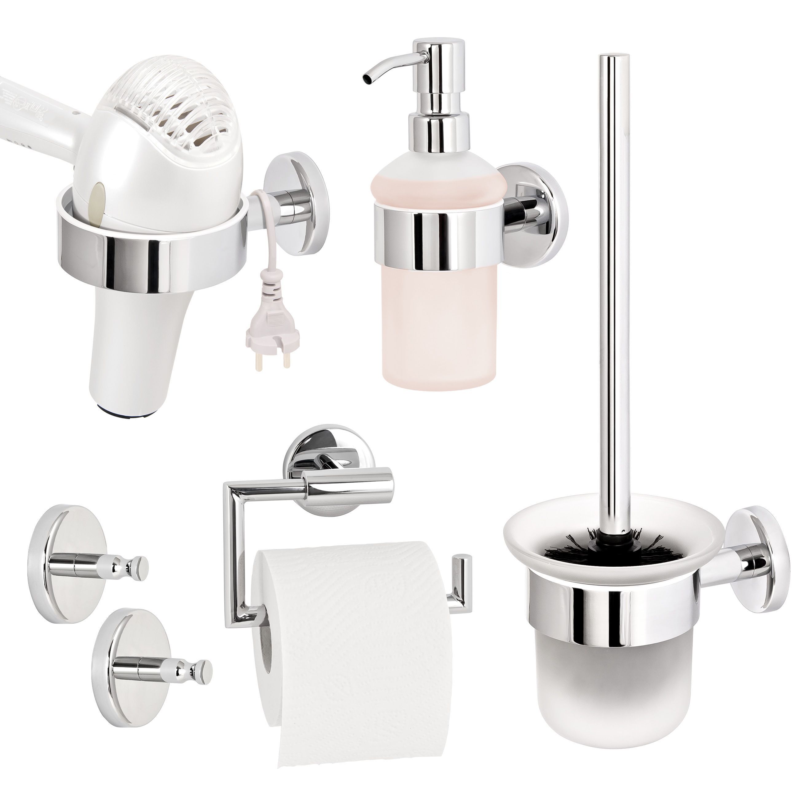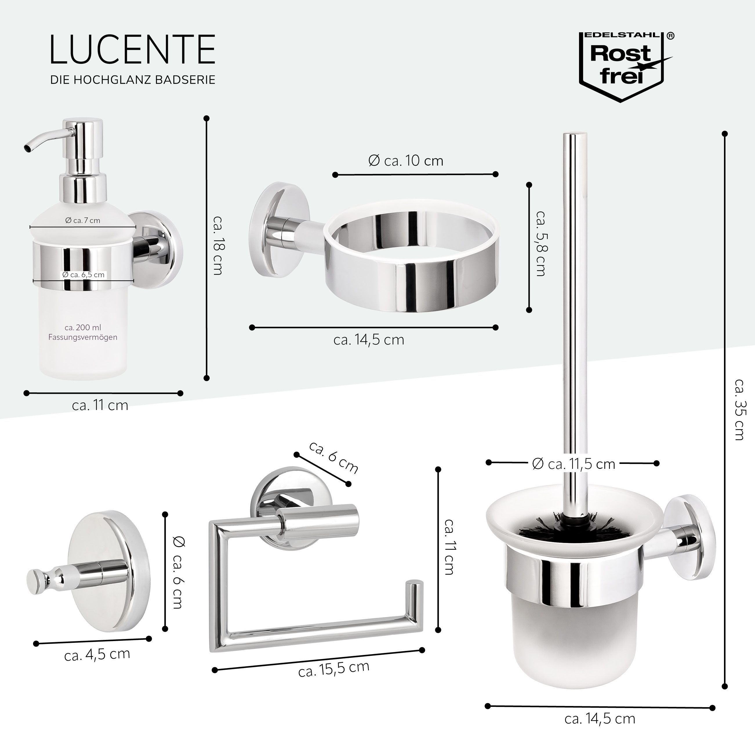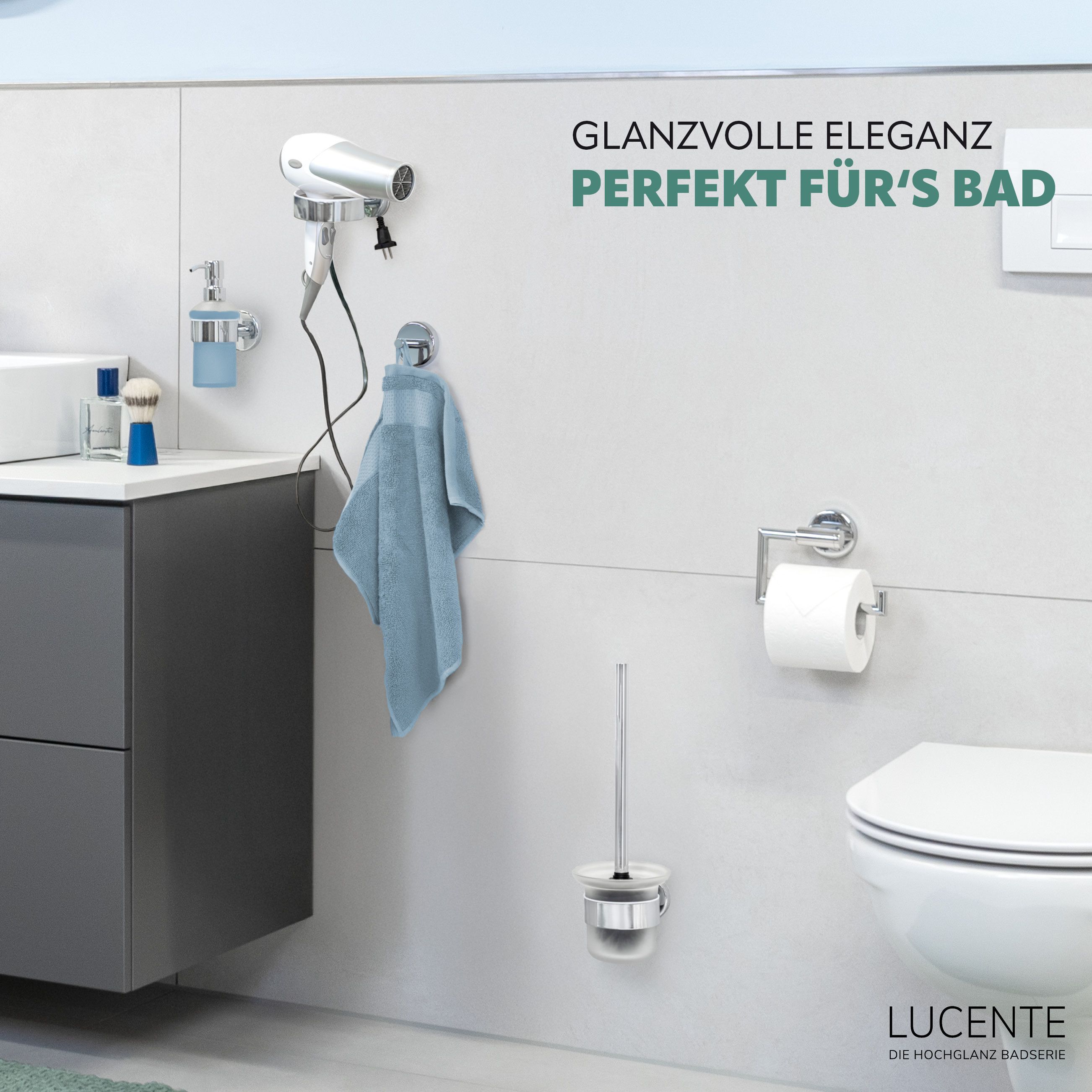 Aus der bremermann Bad-Serie LUCENTE, inklusive Befestigungsmaterial & Montageanleitung aus rostfreiem Edelstahl verchromt Abmessungen (B/H/T) : Toilettenpapierhalter: ca. 15,5 x 11 x 6 cm, WC-Garnitur: ca. 14,5 x 35 x 11,5 cm, Seifenspender: ca. 7 x 18 x 11 cm, Handtuchhaken: ca. 6 x 6 x 4,5 cm, Föhnhalter: ca. 10 x 5,8 x 14,5 cm