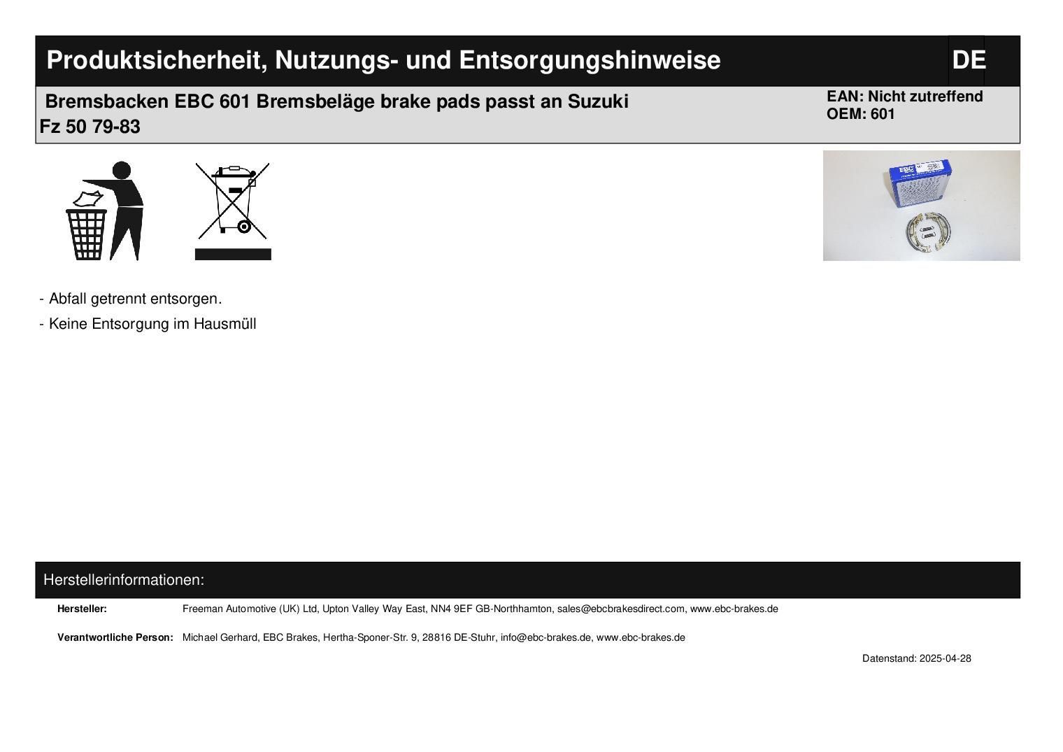 Bremsbacken EBC 601 Bremsbeläge brake pads passt an Suzuki Fz 50 79-83