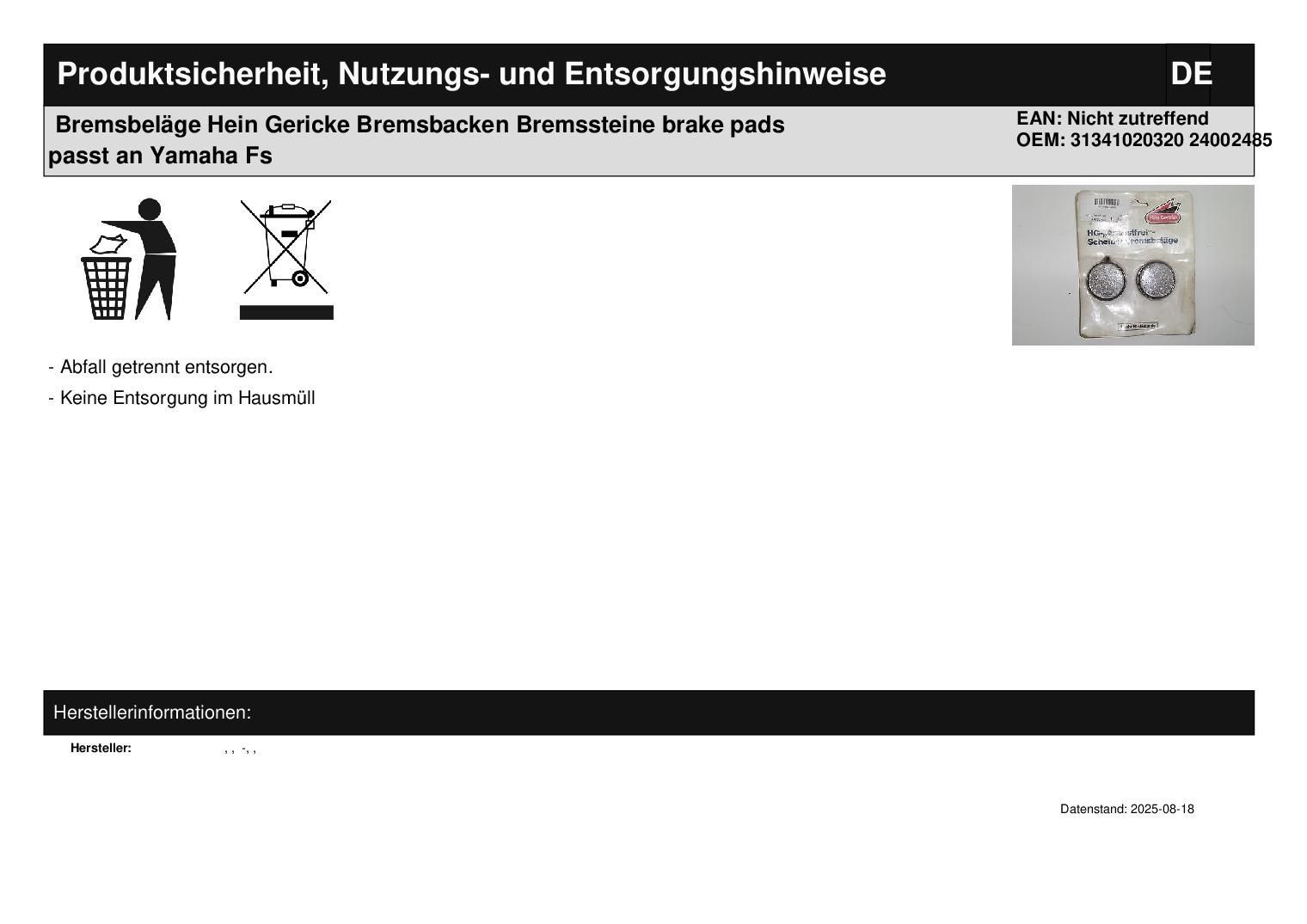 Bremsbeläge Hein Gericke Bremsbacken Bremssteine brake pads passt an Yamaha Fs