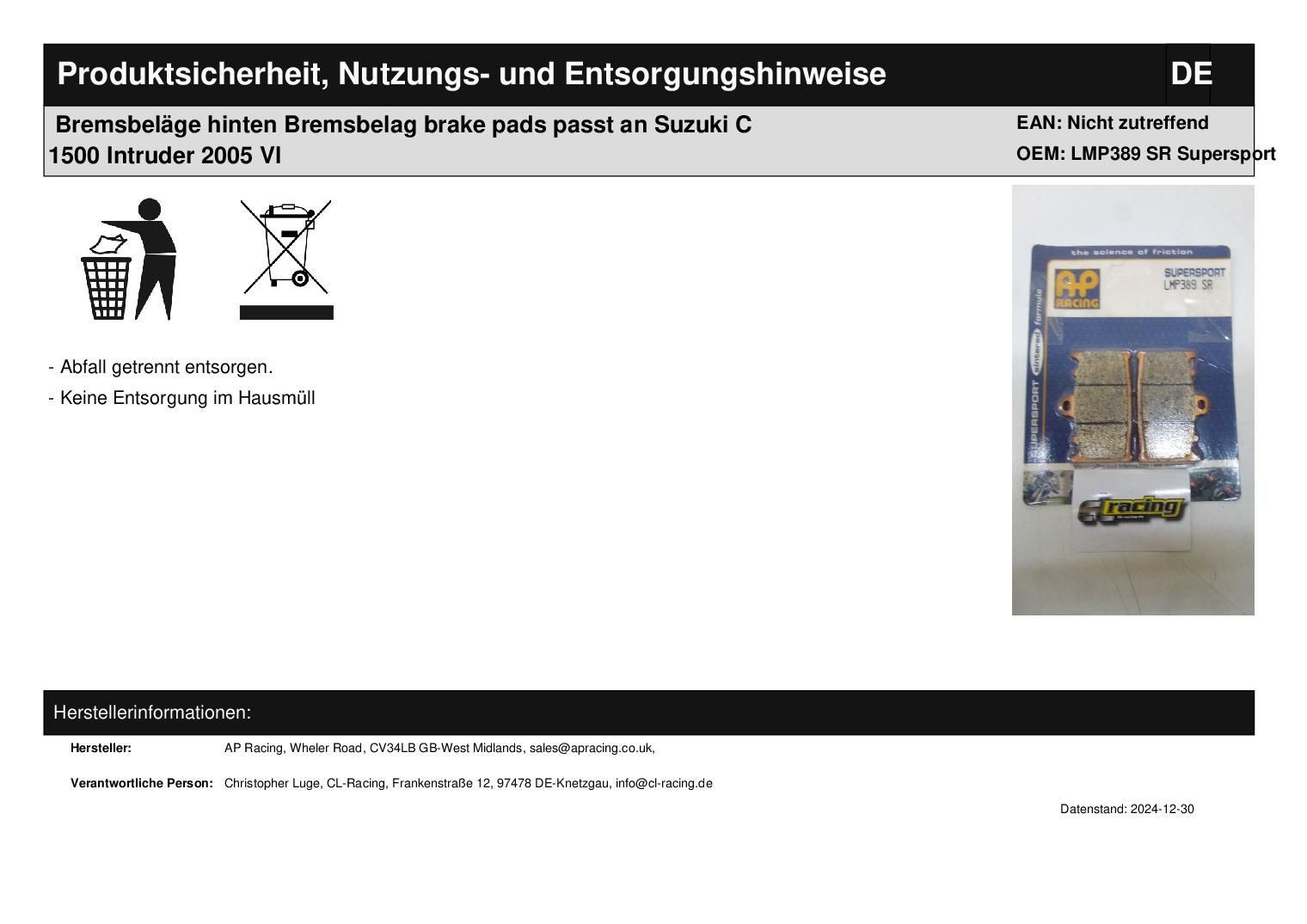Bremsbeläge hinten Bremsbelag brake pads passt an Suzuki C 1500 Intruder 2005 Vl