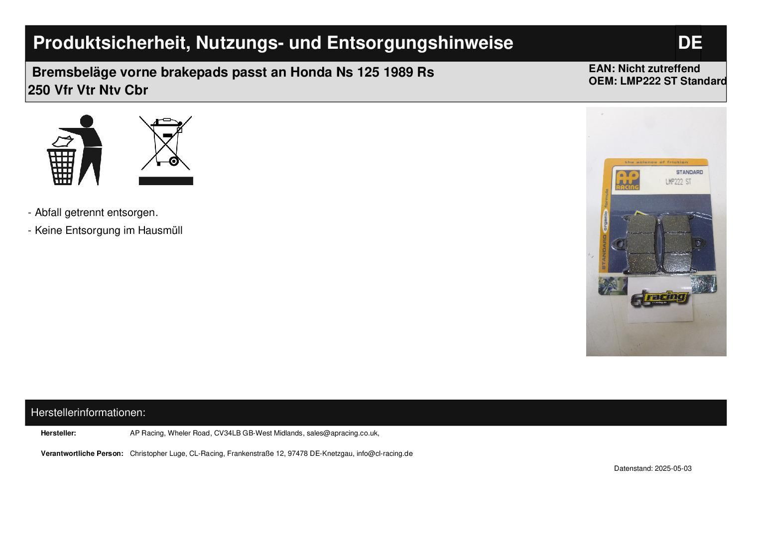 Zu den Herstellungsinformationen zählen die Adresse sowie weitere relevante Angaben zum Hersteller des Produkts.