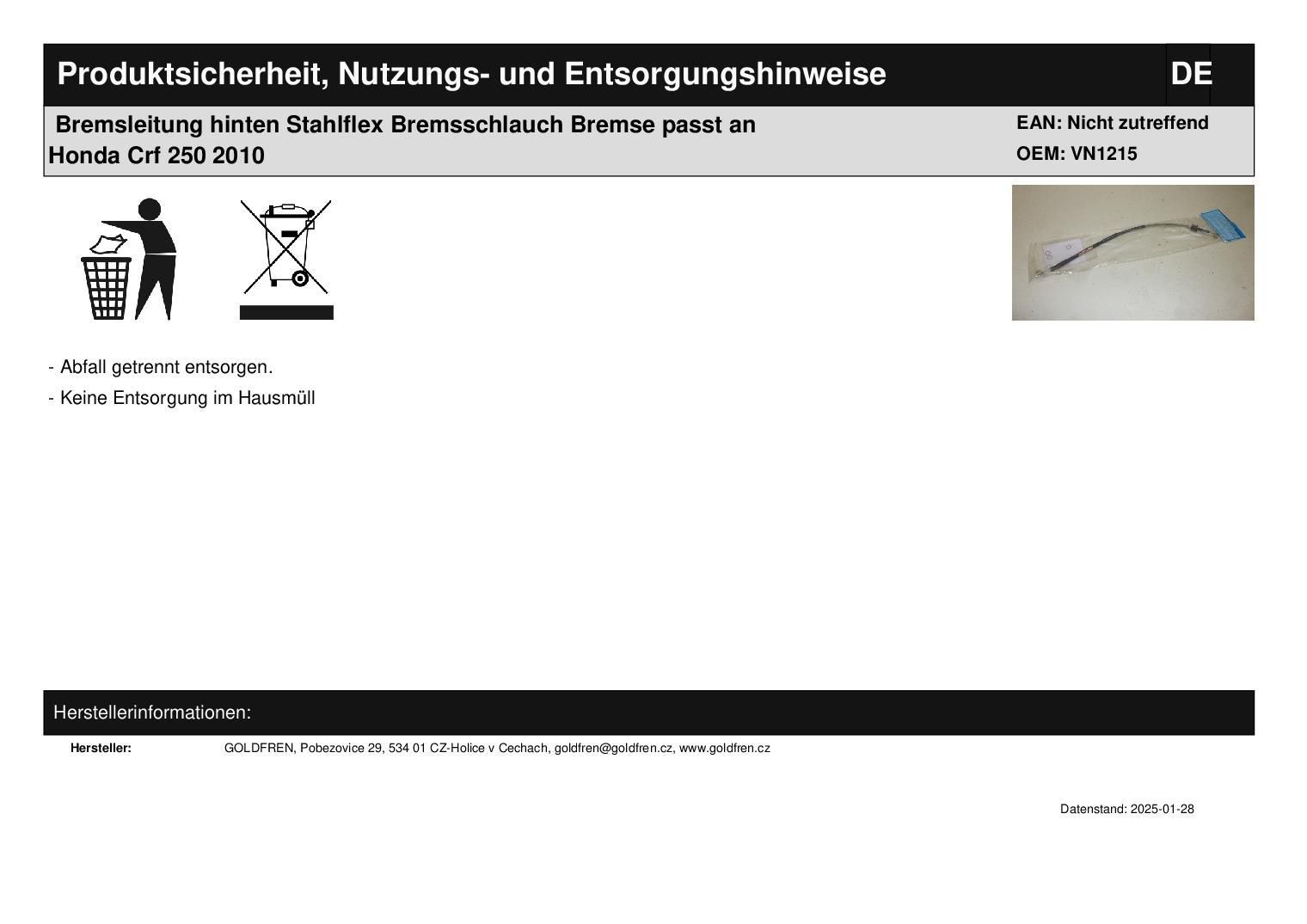 Bremsleitung hinten Stahlflex Bremsschlauch Bremse passt an Honda Crf 250 2010