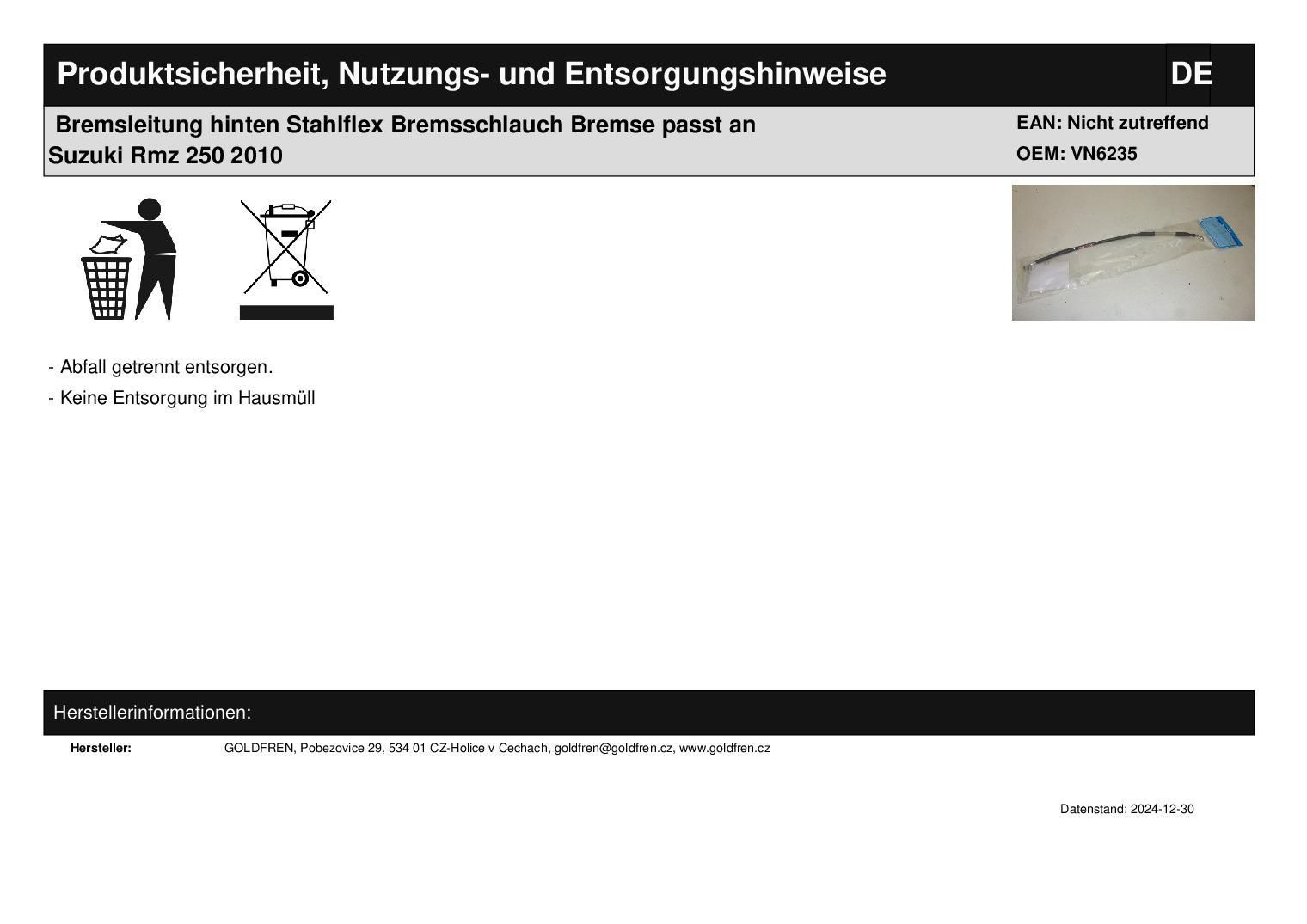 Bremsleitung hinten Stahlflex Bremsschlauch Bremse passt an Suzuki Rmz 250 2010