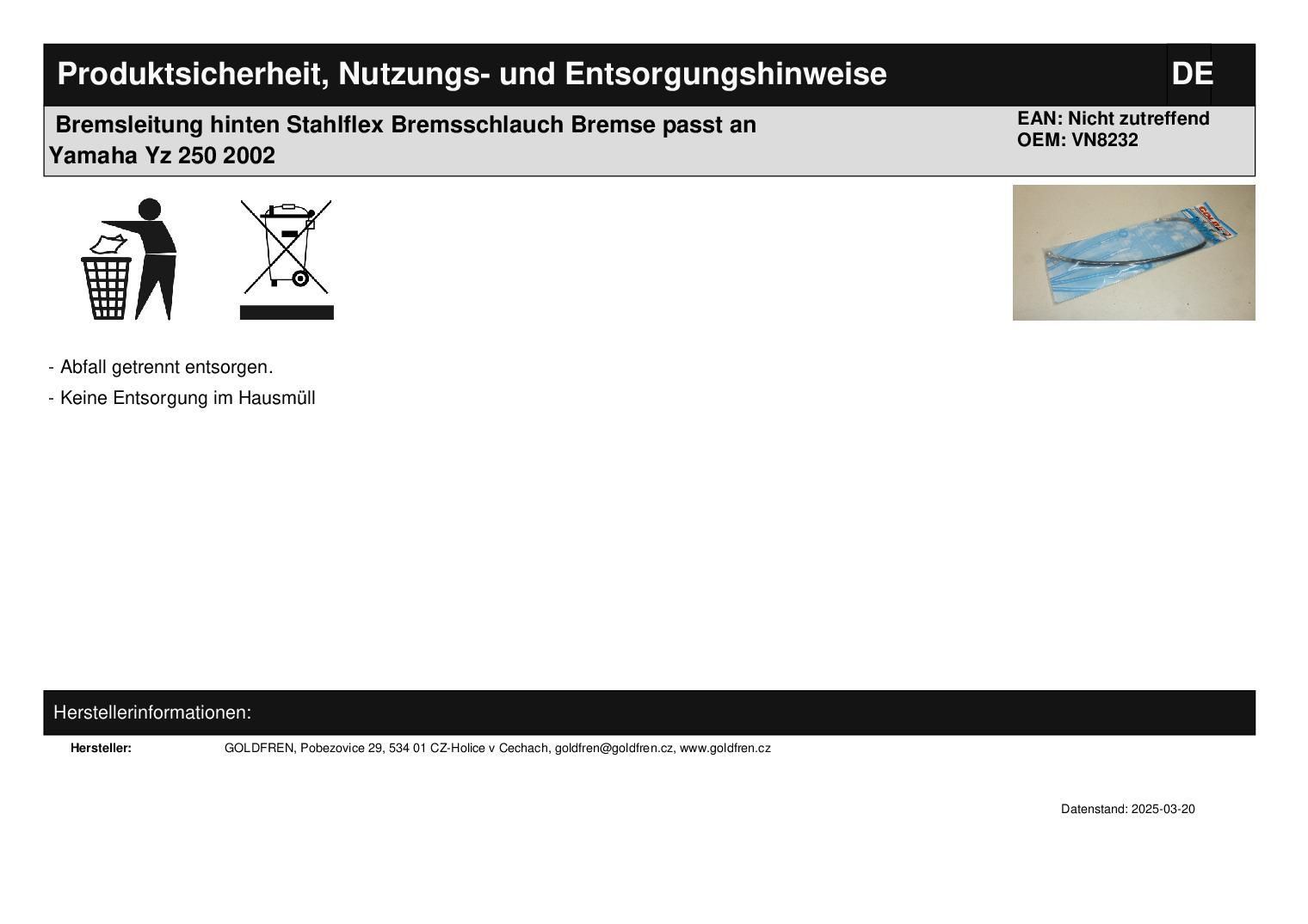 Bremsleitung hinten Stahlflex Bremsschlauch Bremse passt an Yamaha Yz 250 2002