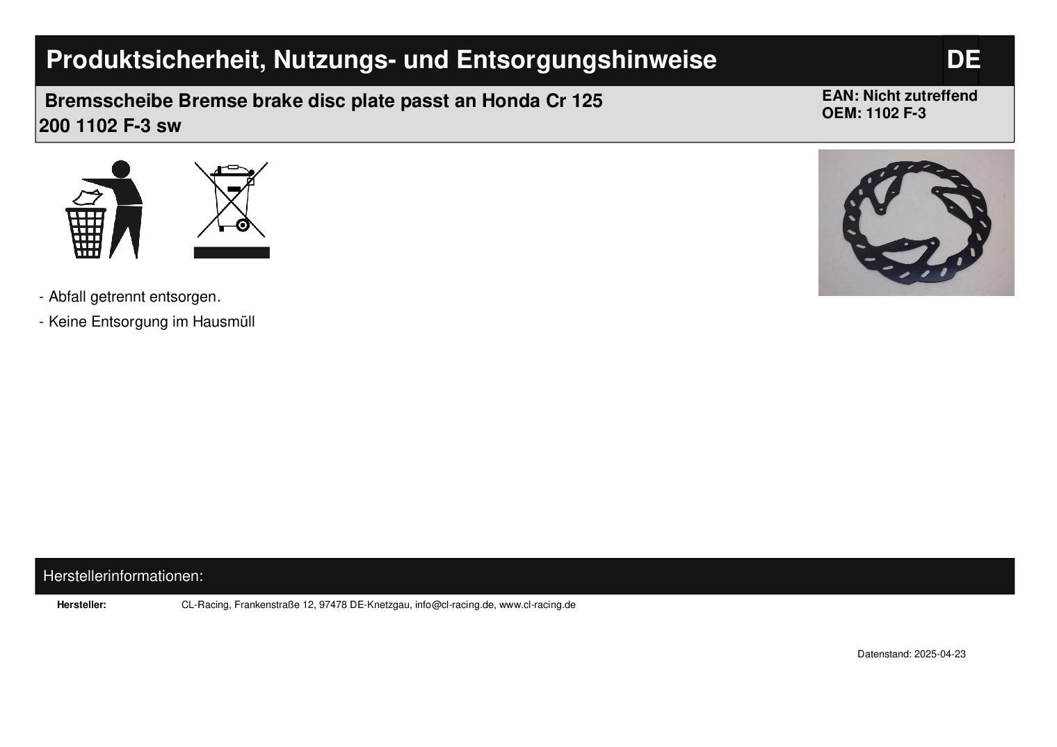 Bremsscheibe Bremse brake disc plate passt an Honda Cr 125 200 1102 F-3 sw