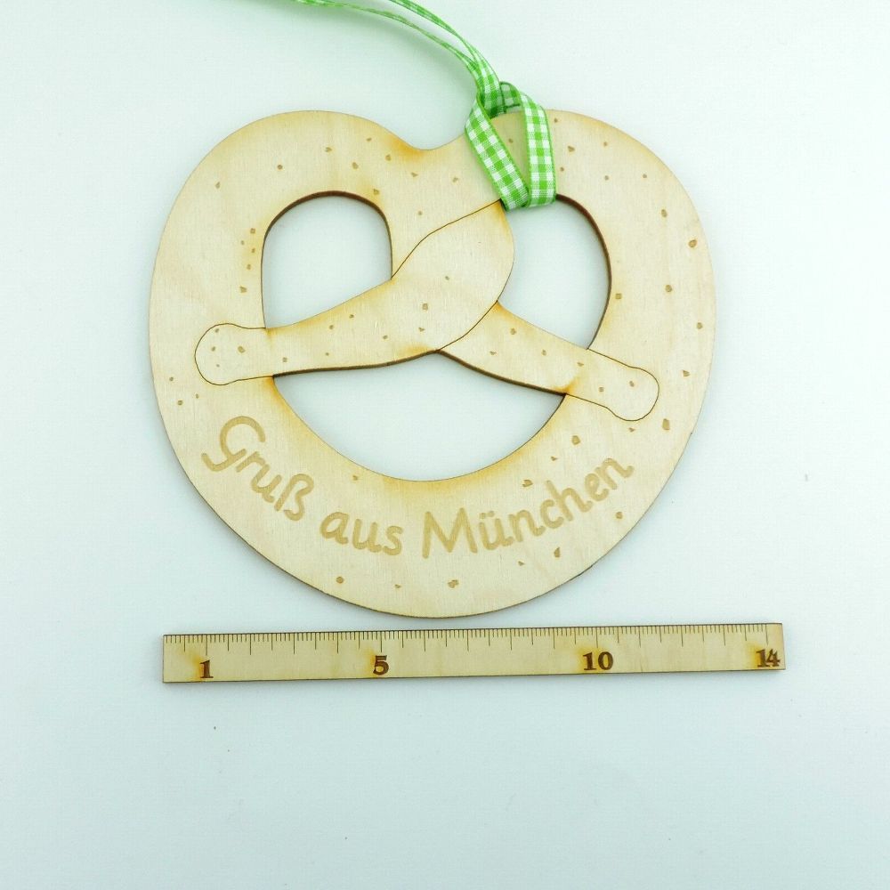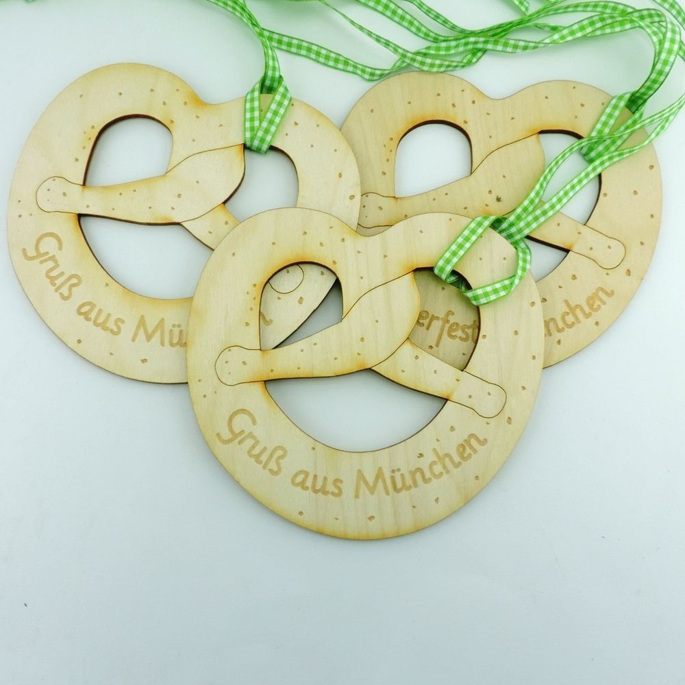 Brezel Gruß aus München 3x mit Band aus Holz 14cm Volksfest Gaudi Wiesenfest