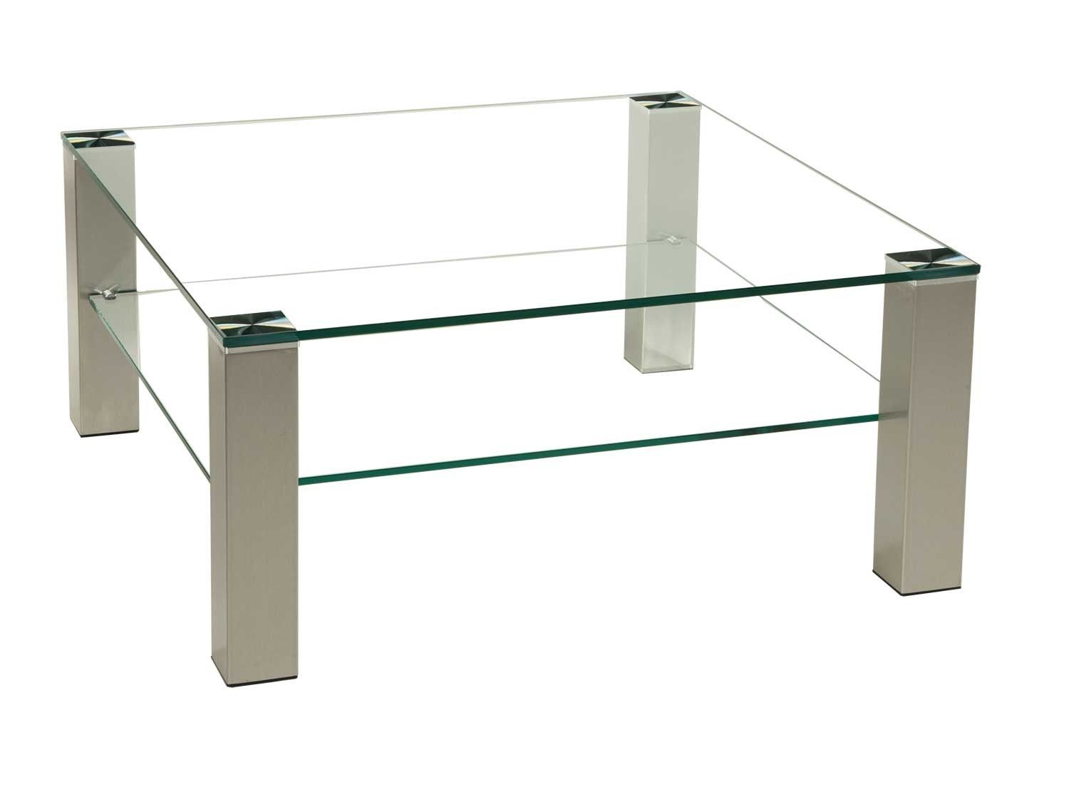BRI1016 Couchtisch Klarglas 70x70x49cm Klarglasablage Edelstahlstollen mit Rollen