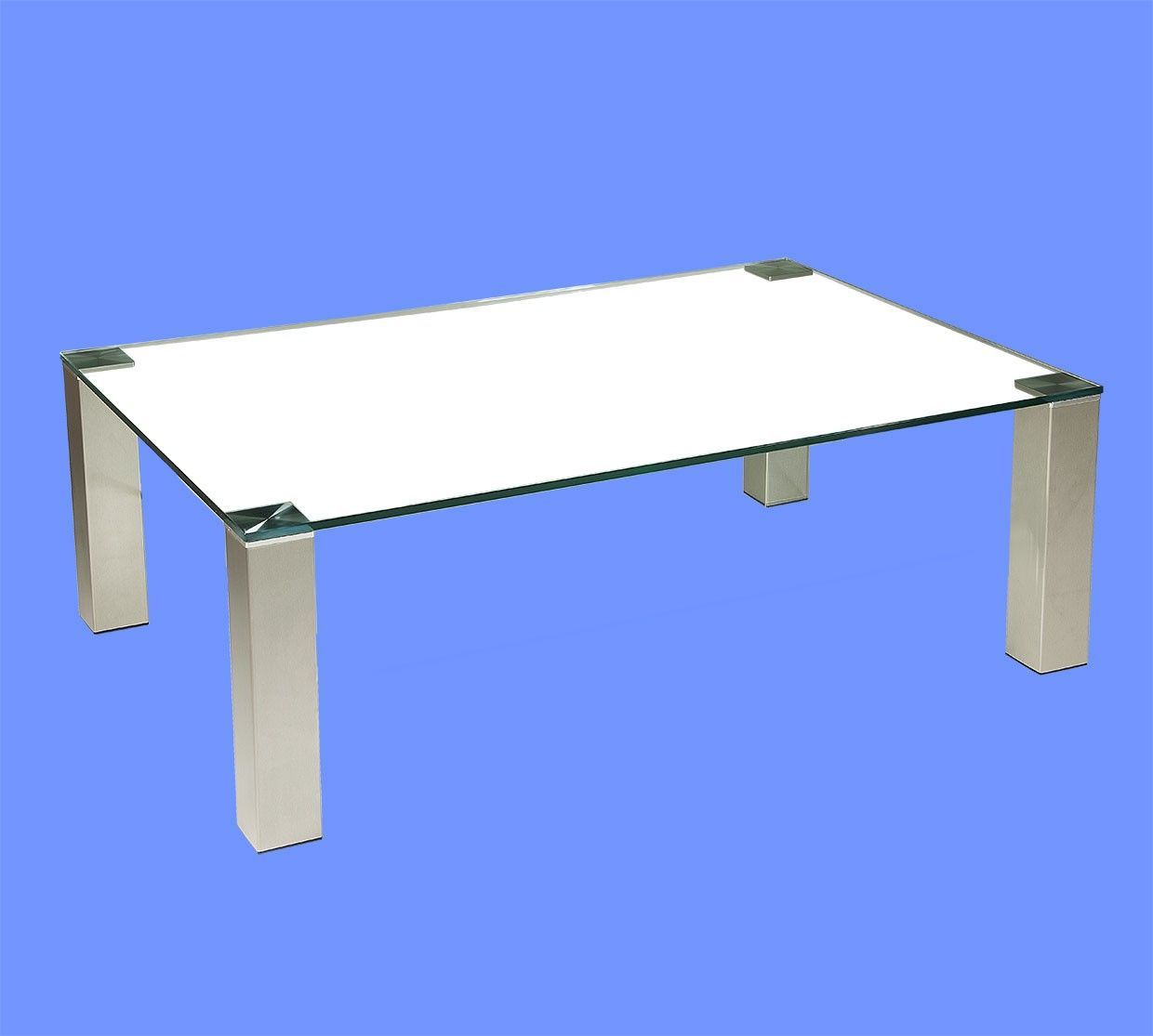 BRI3035 Couchtisch Weißglas 110x70x49cm Edelstahlstollen mit Rollen