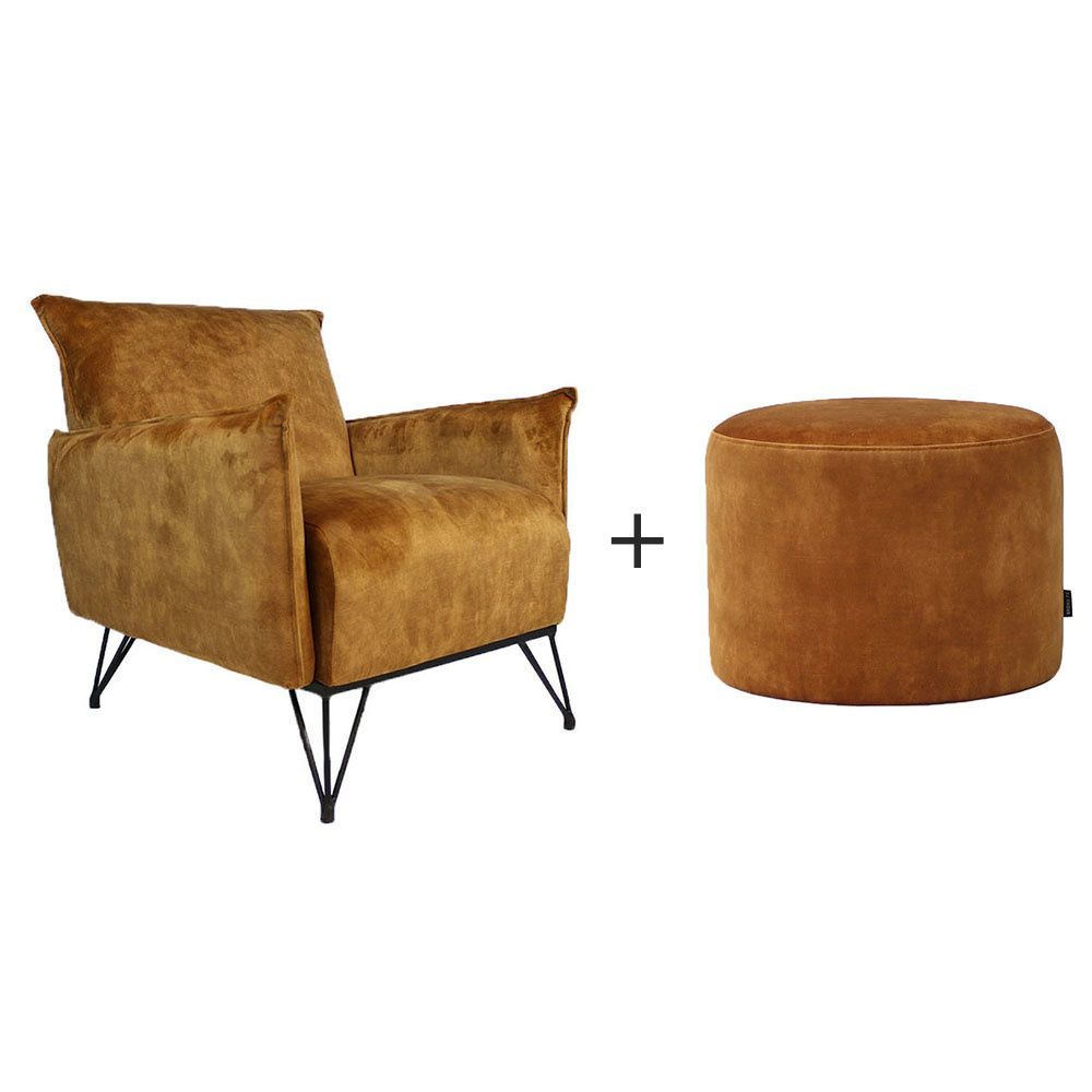 Bronx71 Samt Sessel Mika mit Armlehne und Samt Hocker Beau cognac/braun