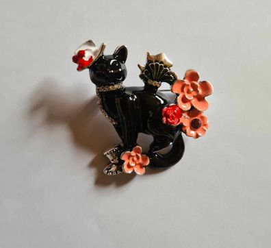 • Schwarze Katzen Brosche, Tier Blumen Schmuck, Emaille Katzen Brosche(K2102257)