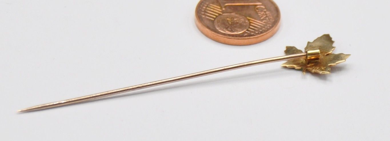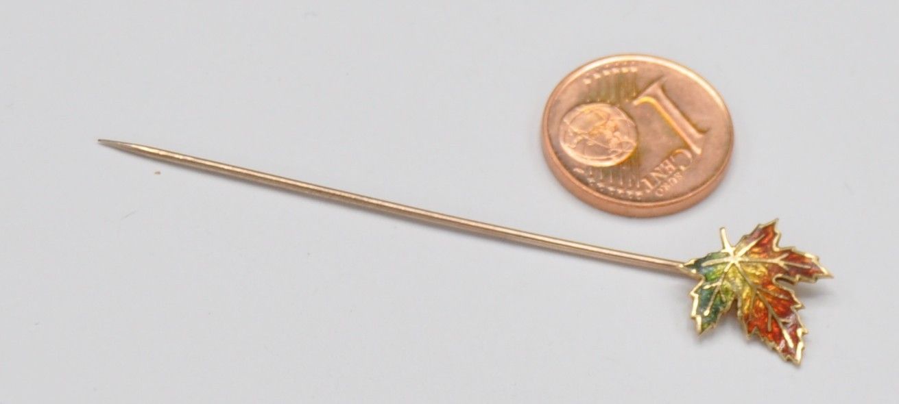 Die Brosche ist fein und solide gearbeitet und wiegt gut 1 Gramm. Das emaillierte Blatt ist sehr gut erhalten und 12,5 mm breit. Das Schmuckstück ist 18 k gestempelt. Ich habe noch mehr Schmuck eingestellt.