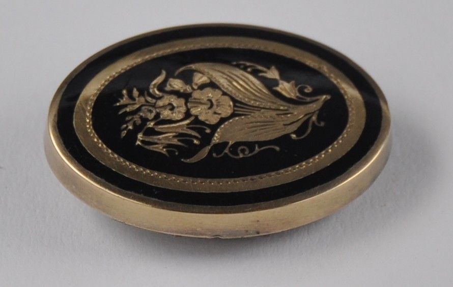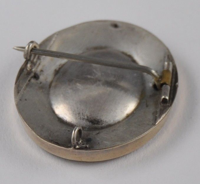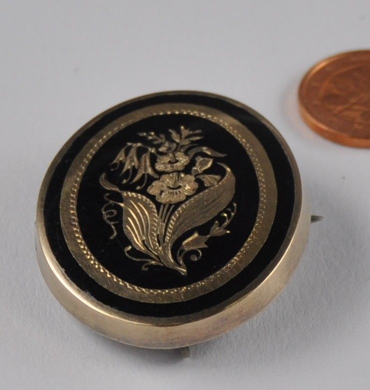 Die Brosche ist stabil und solide gearbeitet und wiegt gut 10 Gramm. Sie ist 3,65 cm hoch und 3 cm breit. Sie ist sehr alt. Ich denke 2. Hälfte 1900 Jahrhundert. Von hinten und die Nadel ist die Brosche aus Silber. Von vorn ist sie emaliert und darin ist das florale Muster eingraviert. Ich vermute das es Trauerschmuck war. Die Brosche ist nicht gestempelt. Der goldene Teil wurde geprüft und er istaus 750 Gold.