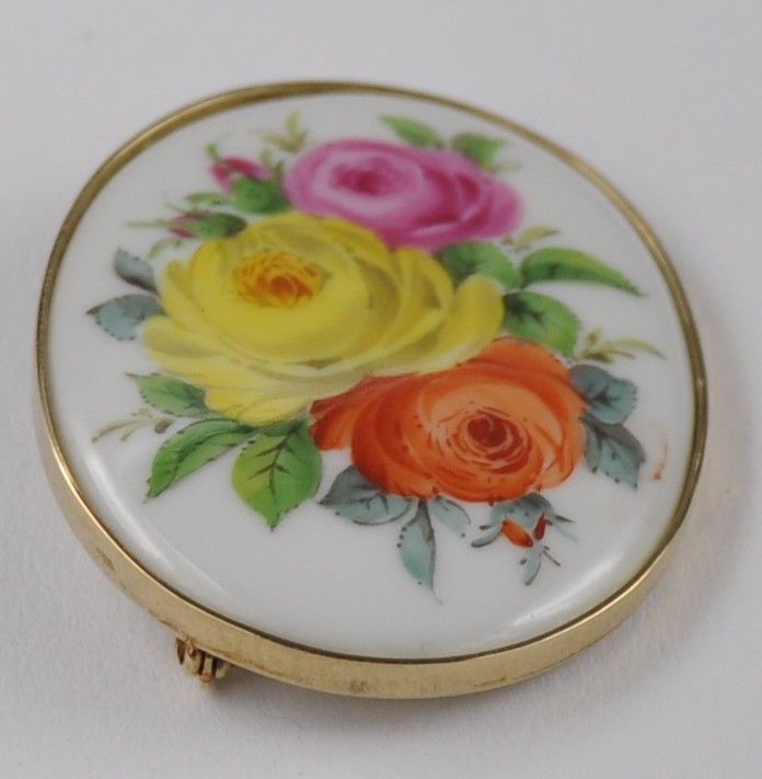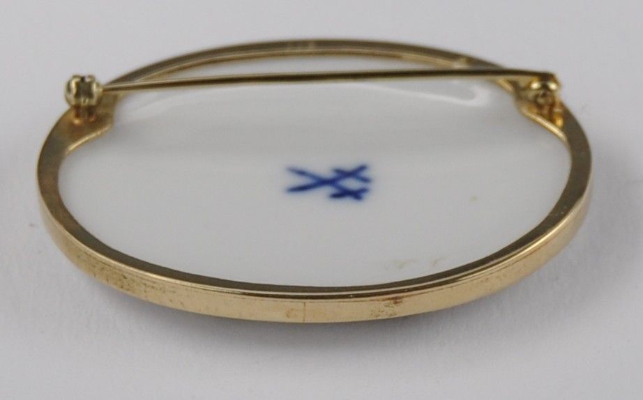 Die Brosche ist massiv und solide gearbeitet und wiegt gut 9,5 Gramm. Sie int 4,3 cm lang und 3,3 cm hoch. Im Gegensatz zu den meisten anderen Meissen Broschen wird diese Brosche waagerecht getragen. Sie ist in einem absolut neuwertigen Zustand. Die Brosche ist mit 585 und mit den Meissen Schwertern gestempelt.