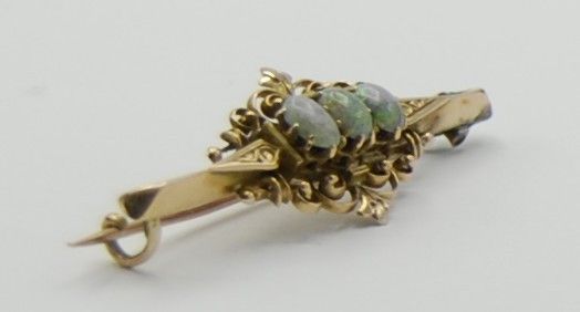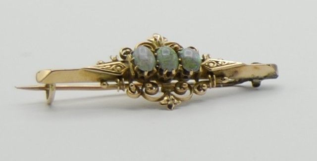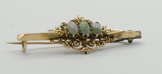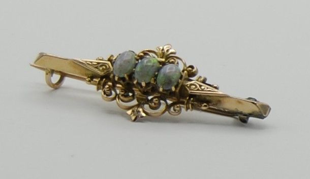 Die Brosche ist fein und edel gearbeitet und wiegt 3 Gramm. Sie ist 4,1 cm lang und in der Mitte 1,5 cm breit. Die 3 Opale haben eine milchig gräuliche Grundfarbe und opalisieren stark in Grün Lila und Blaus. Sehr selten und sehr edel. Da die Brosche keinen Stempel hat wurde sie geprüft und sie ist aus 750 Gold.