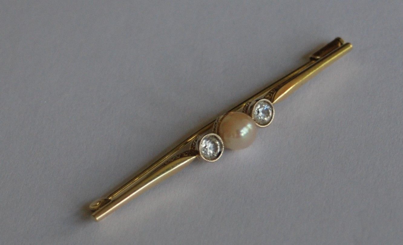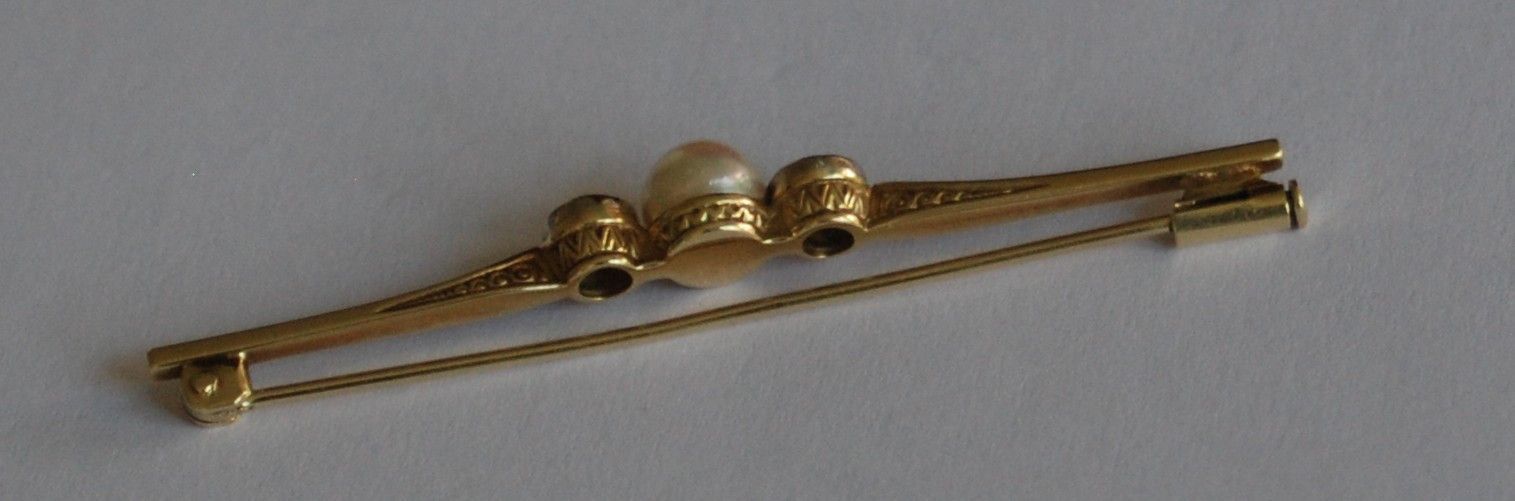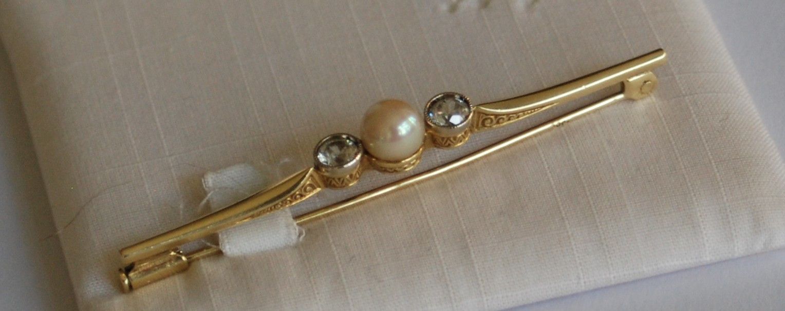 Die Nadel ist sehr alt und ich denke auch Antik. Sie ist in einem tollen Zustand. Auch die Perle hat einen tollen Lüster. Sie ist 6,5 mm groß. Die Brosche selbst ist 6,2 cm lang und hat ein schön ziseliertes Muster. Der Verschluss ist sehr sicher. Die weißen Steine, sind keine Diamanten. Ich denke es sind Saphire im Rosenschliff. Die Brosche ist 585 gestempelt. Ich habe noch mehr Schmuck eingestellt. Andere Schmuckstücke auf Anfrage.