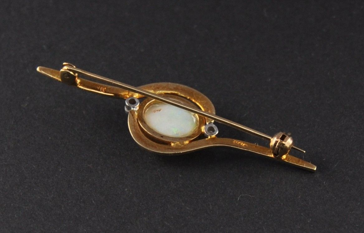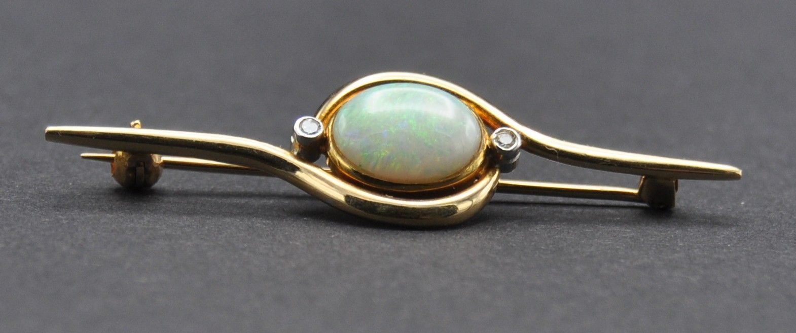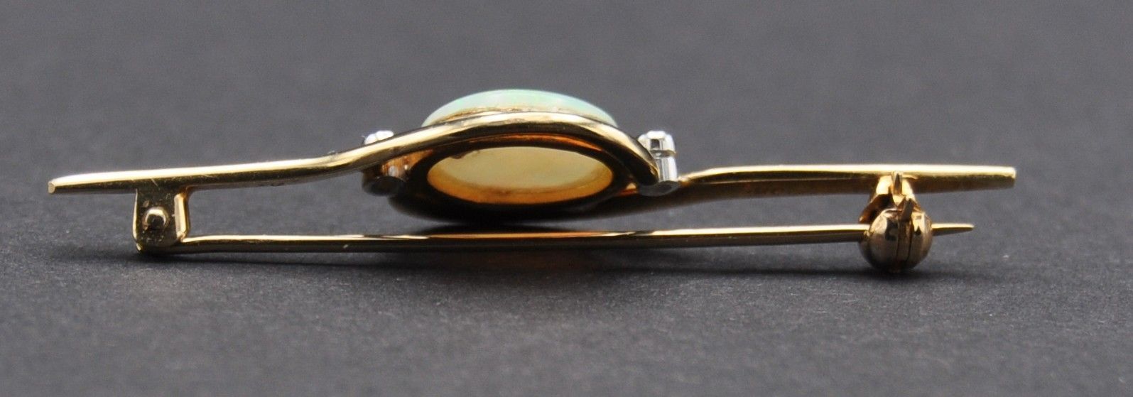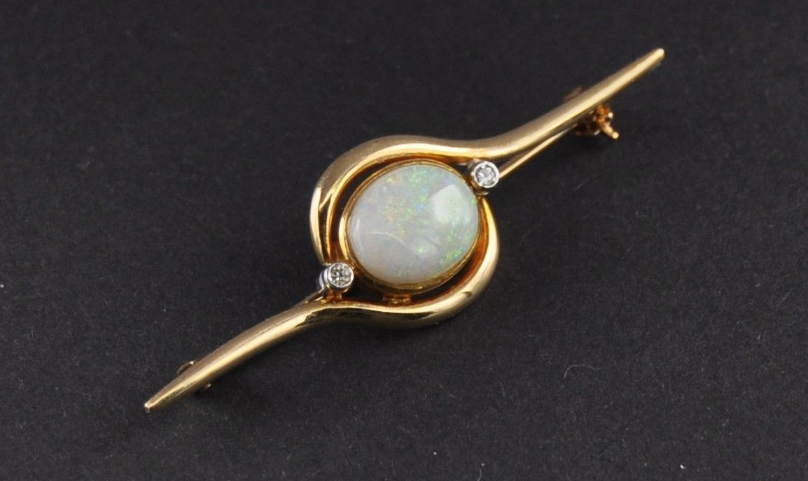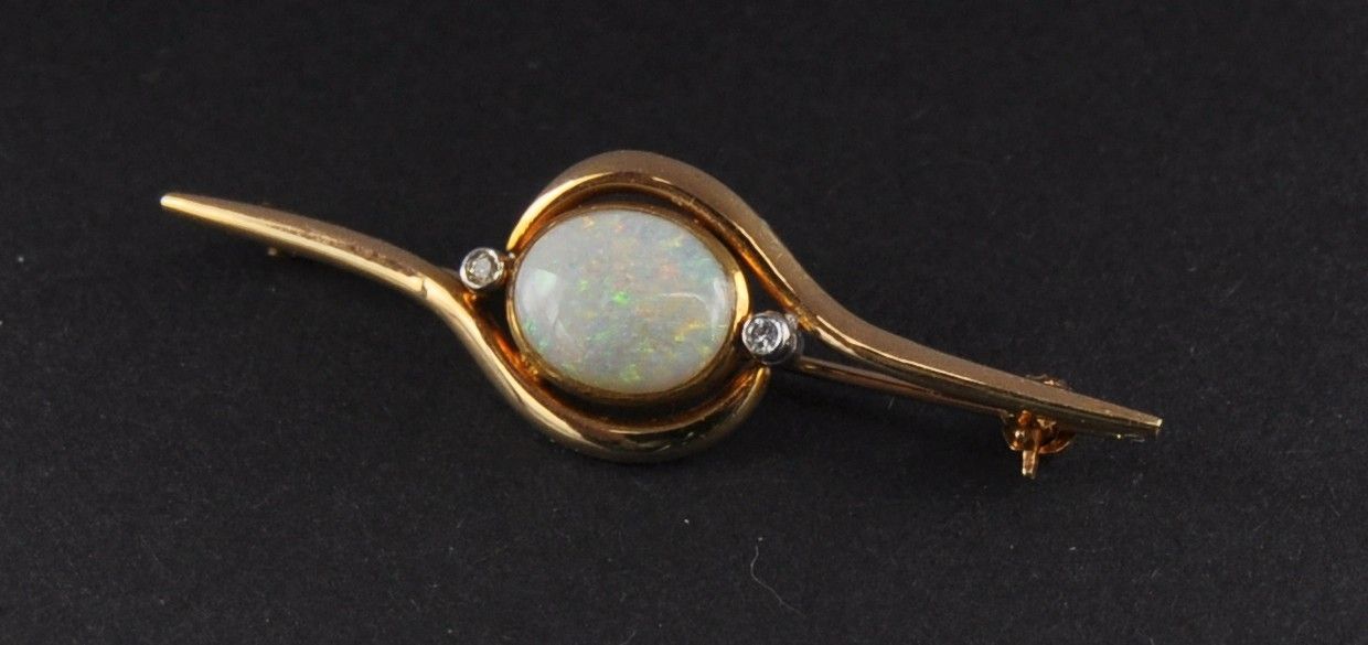 Die Brosche ist stabil und solide in Handarbeit gearbeitet und wiegt gut 3 Gramm. Sie ist 4,7 cm lang und 1,4 cm breit. Der Opal hat eine weiße Grundfrabe und opalisiert punktuell in Grün und Blau. Für ein Milchopal sehr intensive Farben. Neben dem Opal sitzen 2 Diamanten in einer Weißgold Zarge gefasst. Die Brosche ist 585 gestempelt. Ich habe noch mehr Schmuck eingestellt. Andere Schmuckstücke auf Anfrage.