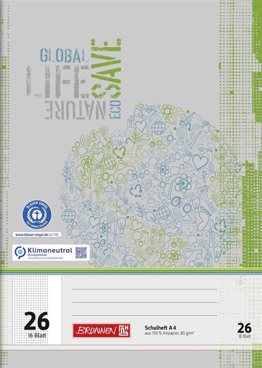 BRUNNEN Brunnen 104412601 Schulheft Recycling A4 kariert, mit Rand, Lin. 26 grau-grün