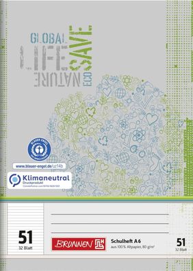 • Brunnen 104613101 Schulheft Recycling A6 liniert, Lin. 51 grau-grün