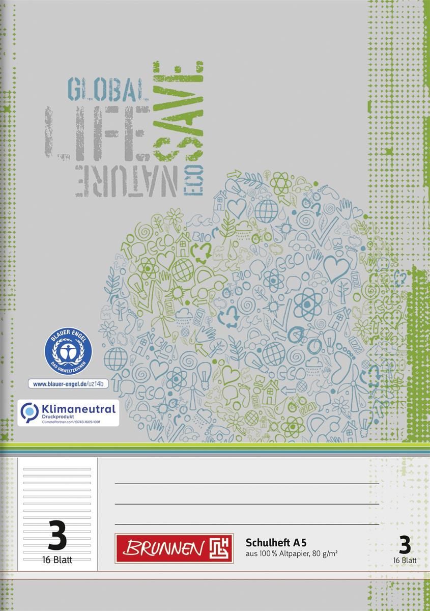 BRUNNEN Brunnen 104510301 Schulheft Recycling A5 14 Liniensysteme, Lin. 3 grau-grün