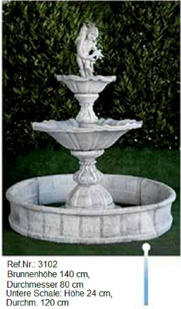 Ein wunderschöner Brunnen mit zwei Etagen und einer Knabenfigur als Wasserauslauf, bestehend aus witterungs- und frostbeständigem Weißstein. Mit einer Pumpe, die das Wasser in einen geschlossenen Kreislauf immer wieder von unten zum oberen Auslauf pumpt und bei uns auch erhältlich ist, hat man eine wunderschöne Wasserfontäne.