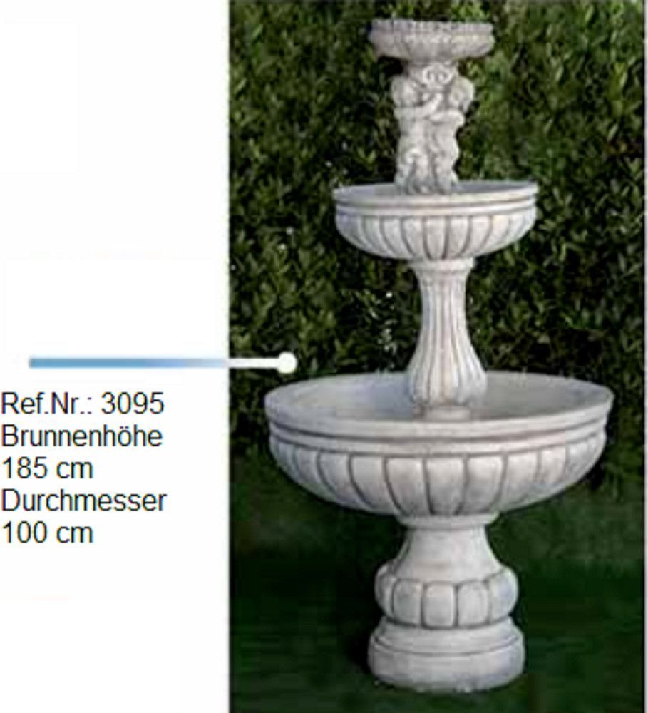 Ein wunderschöner Brunnen mit drei Etagen und einer Knabenfigur als Wasserauslauf, bestehend aus witterungs- und frostbeständigem Weißstein. Mit einer Pumpe, die das Wasser in einen geschlossenen Kreislauf immer wieder von unten zum oberen Auslauf pumpt und bei uns auch erhältlich ist, hat man eine wunderschöne Wasserfontäne.