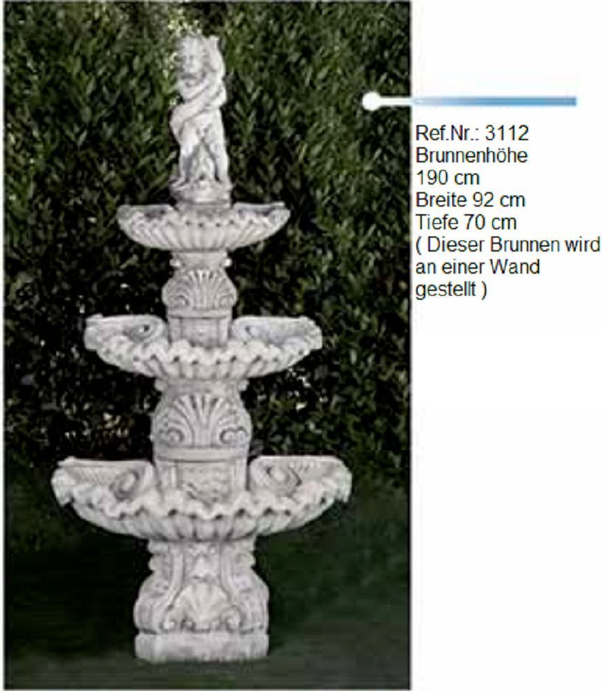 Brunnen aus Weißstein mit 3 Schalen und einer Knabenfigur ( Ref.Nr. 3112 ) Ein wunderschöner Brunnen mit drei Schalen und einer Knabenfigur als Wasserauslauf, bestehend aus witterungs- und frostbeständigem Weißstein. Mit einer Pumpe, die das Wasser in einen geschlossenen Kreislauf immer wieder von unten zum oberen Auslauf pumpt und bei uns zu enthalten ist, kann man ihn für wundervolle Wasserspiele nutzen. Höhe: 190 cm Breite: 92 cm Tiefe: 70 cm Kg: 247