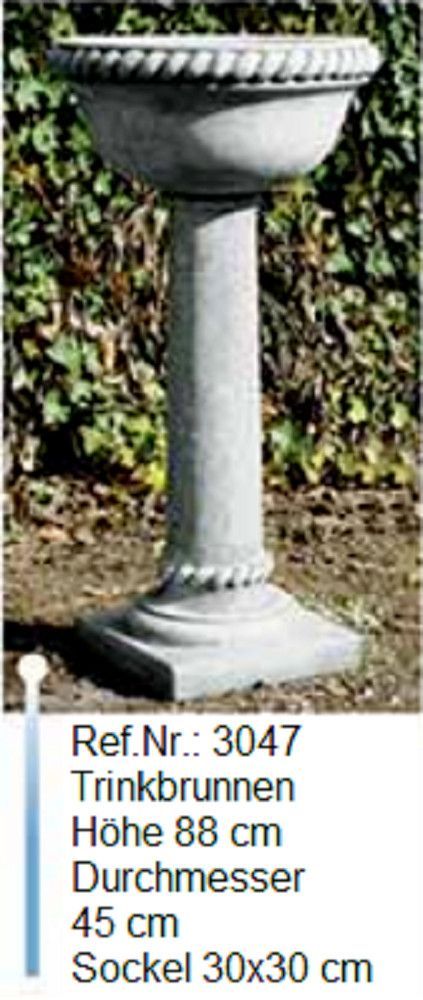 Ein wunderschöner Brunnen mit einer Schale, den man auch als Trinkbrunnen nutzen kann, bestehend aus witterungs- und frostbeständigem Weißstein. Mit einer Pumpe, die das Wasser in einen geschlossenen Kreislauf immer wieder von unten zum oberen Auslauf pumpt und bei uns auch erhältlich ist, hat man eine wunderschöne Wasserfontäne.