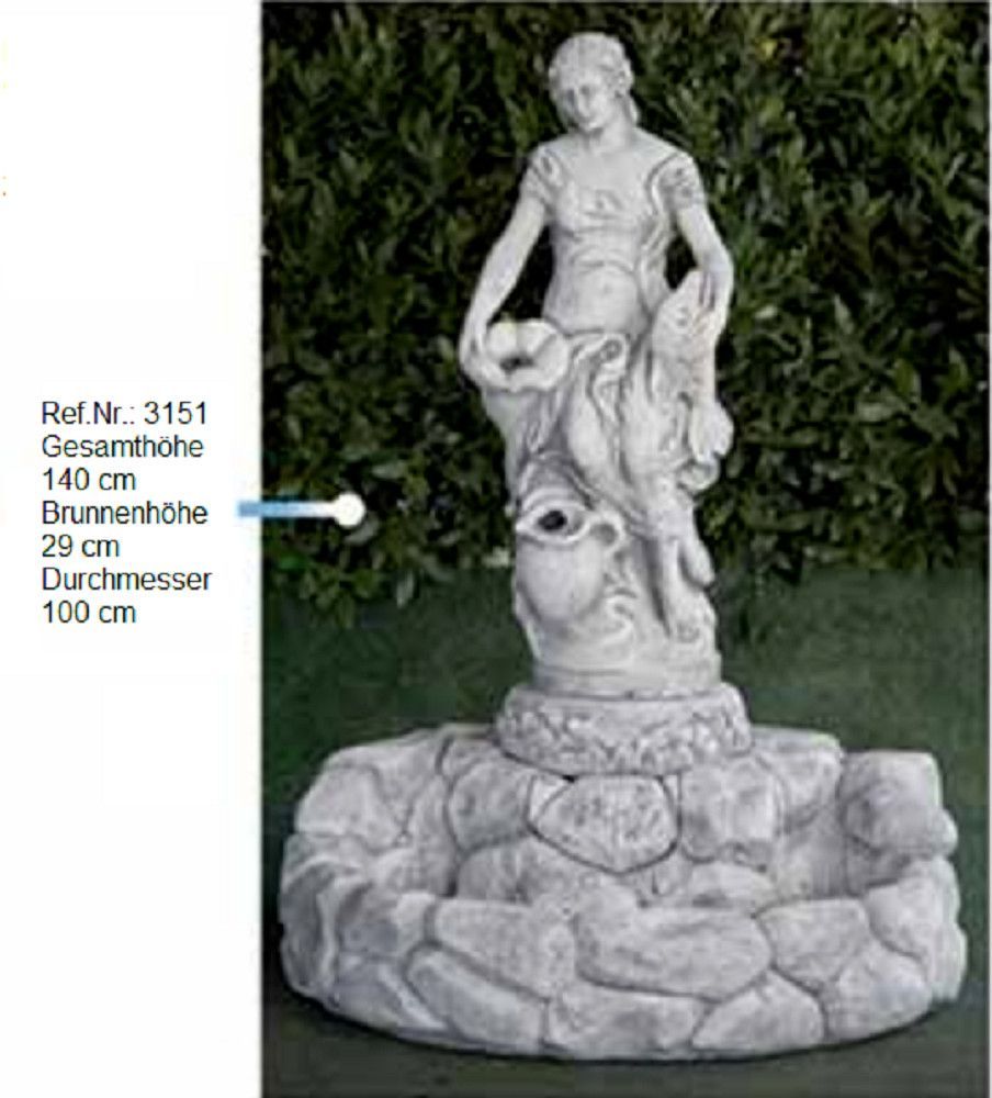 Ein wunderschöner Brunnen mit einer Schale und einer Frauenfigur als Wasserauslauf, bestehend aus witterungs- und frostbeständigem Weißstein. Mit einer Pumpe, die das Wasser in einen geschlossenen Kreislauf immer wieder von unten zum oberen Auslauf pumpt und bei uns auch erhältlich ist, hat man eine wunderschöne Wasserfontäne