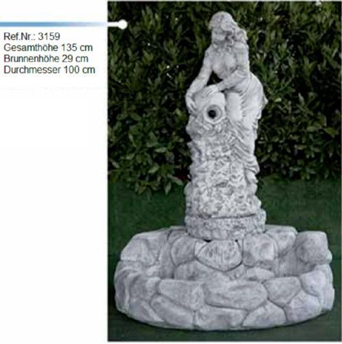 Ein wunderschöner Brunnen mit einer Schale und einer Frauenfigur als Wasserauslauf, bestehend aus witterungs- und frostbeständigem Weißstein. Mit einer Pumpe, die das Wasser in einen geschlossenen Kreislauf immer wieder von unten zum oberen Auslauf pumpt und bei uns auch erhältlich ist, hat man eine wunderschöne Wasserfontäne.