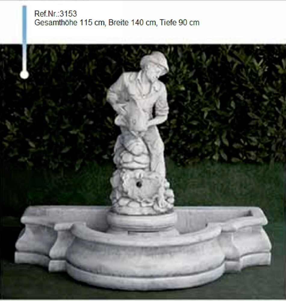 Ein wunderschöner Brunnen mit einer Schale und einer Männerfigur als Wasserauslauf, bestehend aus witterungs- und frostbeständigem Weißstein. Mit einer Pumpe, die das Wasser in einen geschlossenen Kreislauf immer wieder von unten zum oberen Auslauf pumpt und bei uns auch erhältlich ist, hat man eine wunderschöne Wasserfontäne.