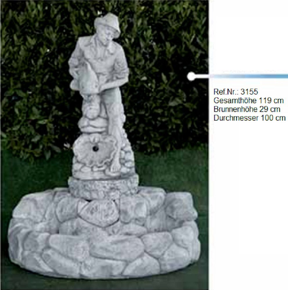 Ein wunderschöner Brunnen mit einer Schale und einer Männerfigur als Wasserauslauf, bestehend aus witterungs- und frostbeständigem Weißstein. Mit einer Pumpe, die das Wasser in einen geschlossenen Kreislauf immer wieder von unten zum oberen Auslauf pumpt und bei uns auch erhältlich ist, hat man eine wunderschöne Wasserfontäne.