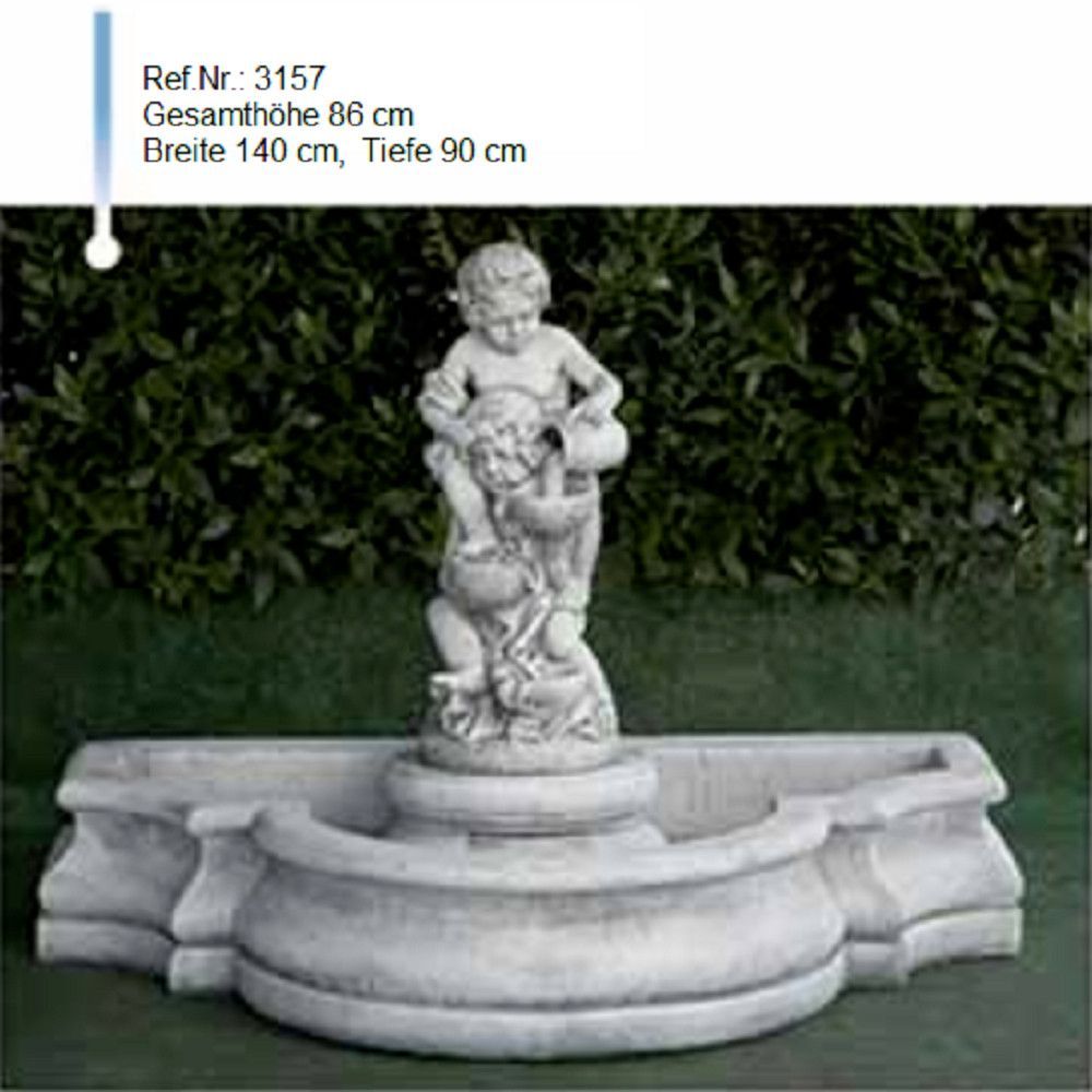 Ein wunderschöner Brunnen mit einer Schale und zwei Knabenfiguren als Wasserauslauf, bestehend aus witterungs- und frostbeständigem Weißstein. Mit einer Pumpe, die das Wasser in einen geschlossenen Kreislauf immer wieder von unten zum oberen Auslauf pumpt und bei uns auch erhältlich ist, hat man eine wunderschöne Wasserfontäne.