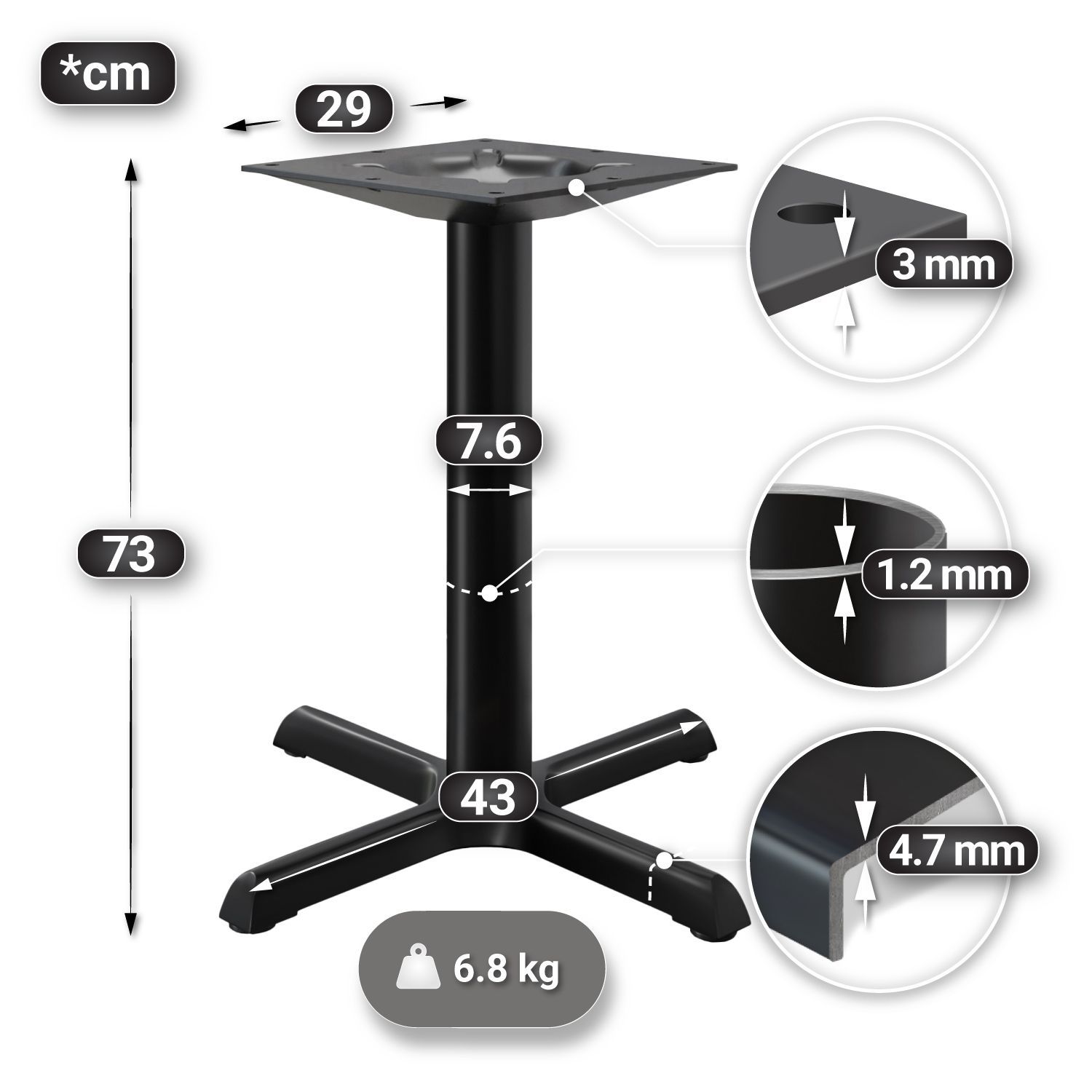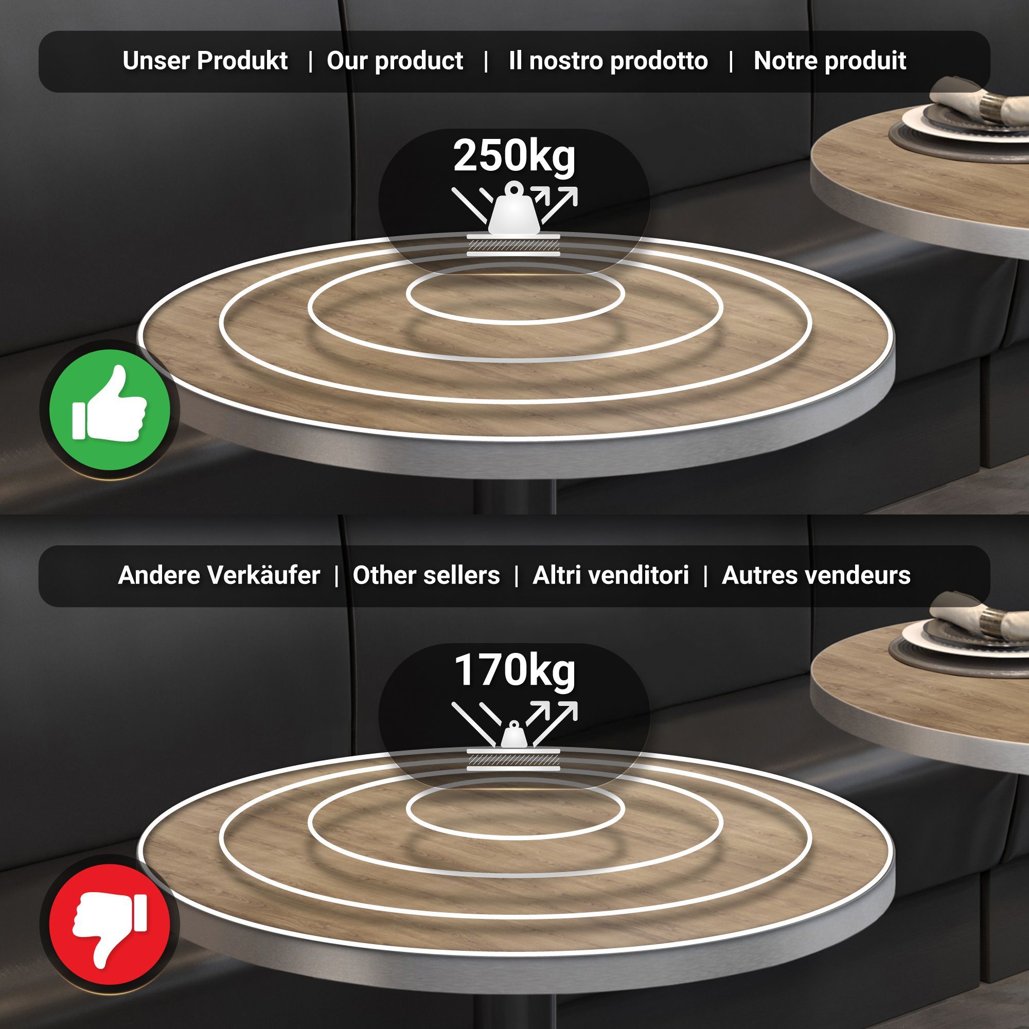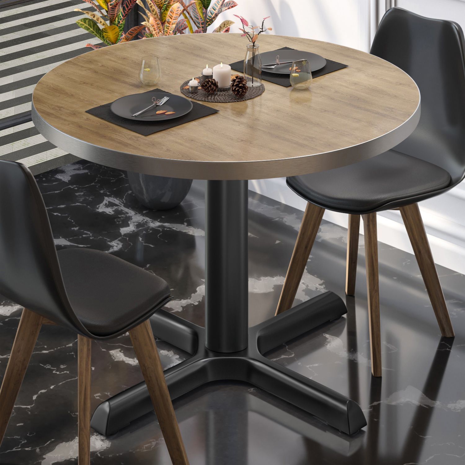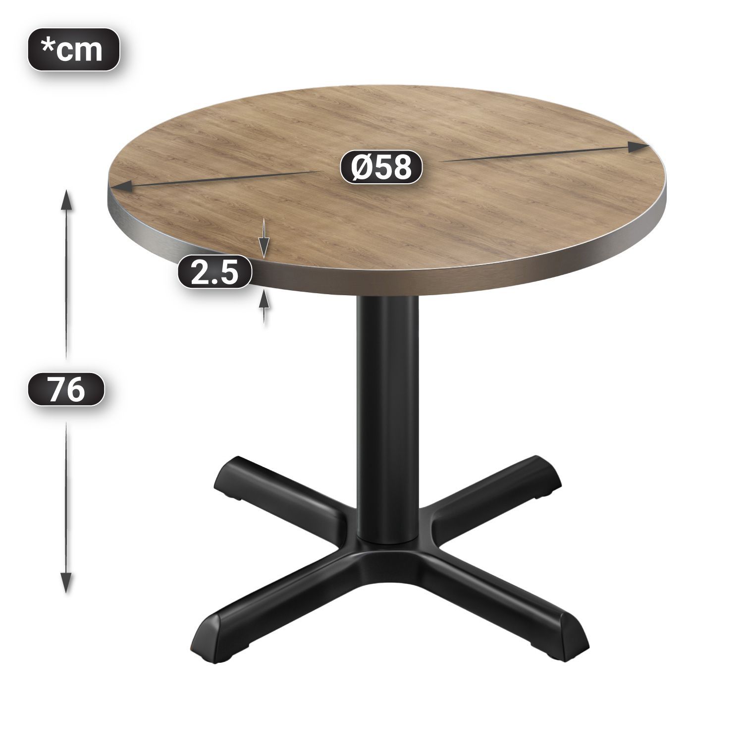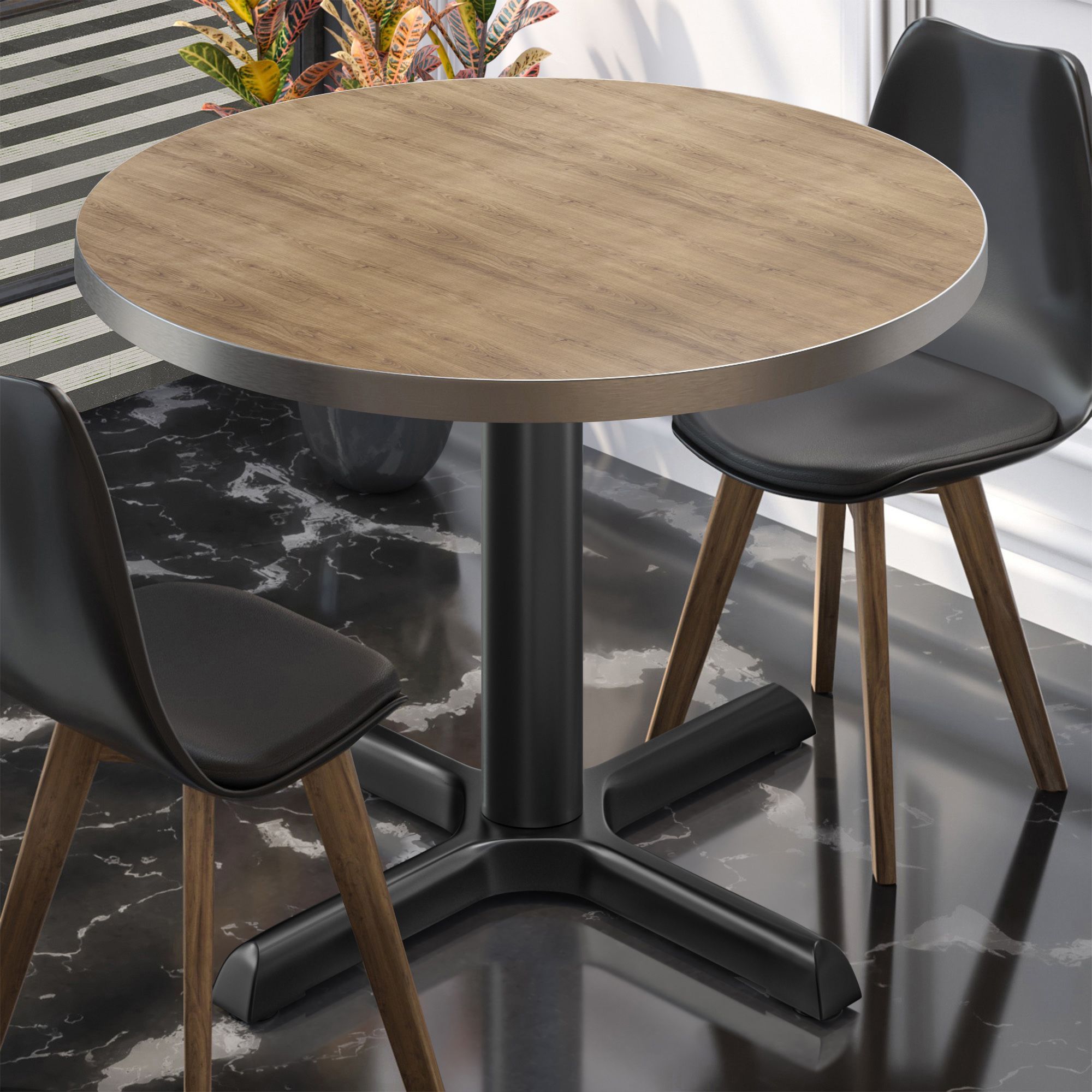 BSM | Bistro Tisch | Ø 60 x 74,5 cm | Edelstahl Rand | Rund | Eiche / Schwarz | Bist