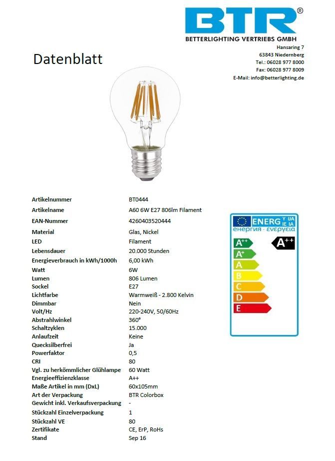 BT0444, A60 6W E27 806lm Filament Glühbirne Leuchtmittel
