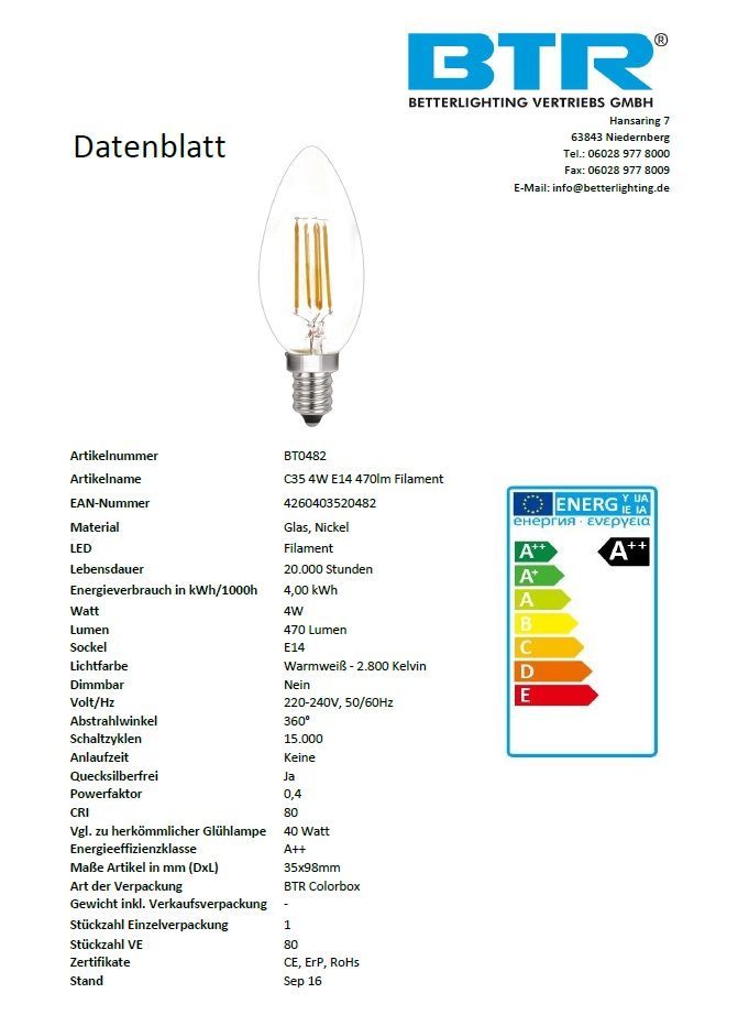BT0482, C35 4W E14 470lm Filament Glühbirne
