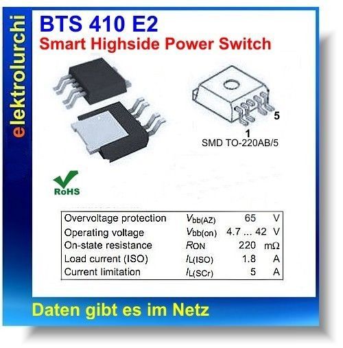 BTS410E2, Smart Highside Power Switch, 5Amp./65VDC, SMD TO220AB-5, 1St.