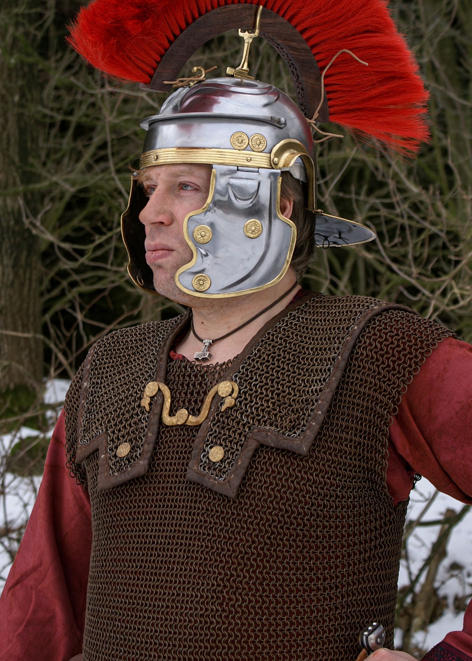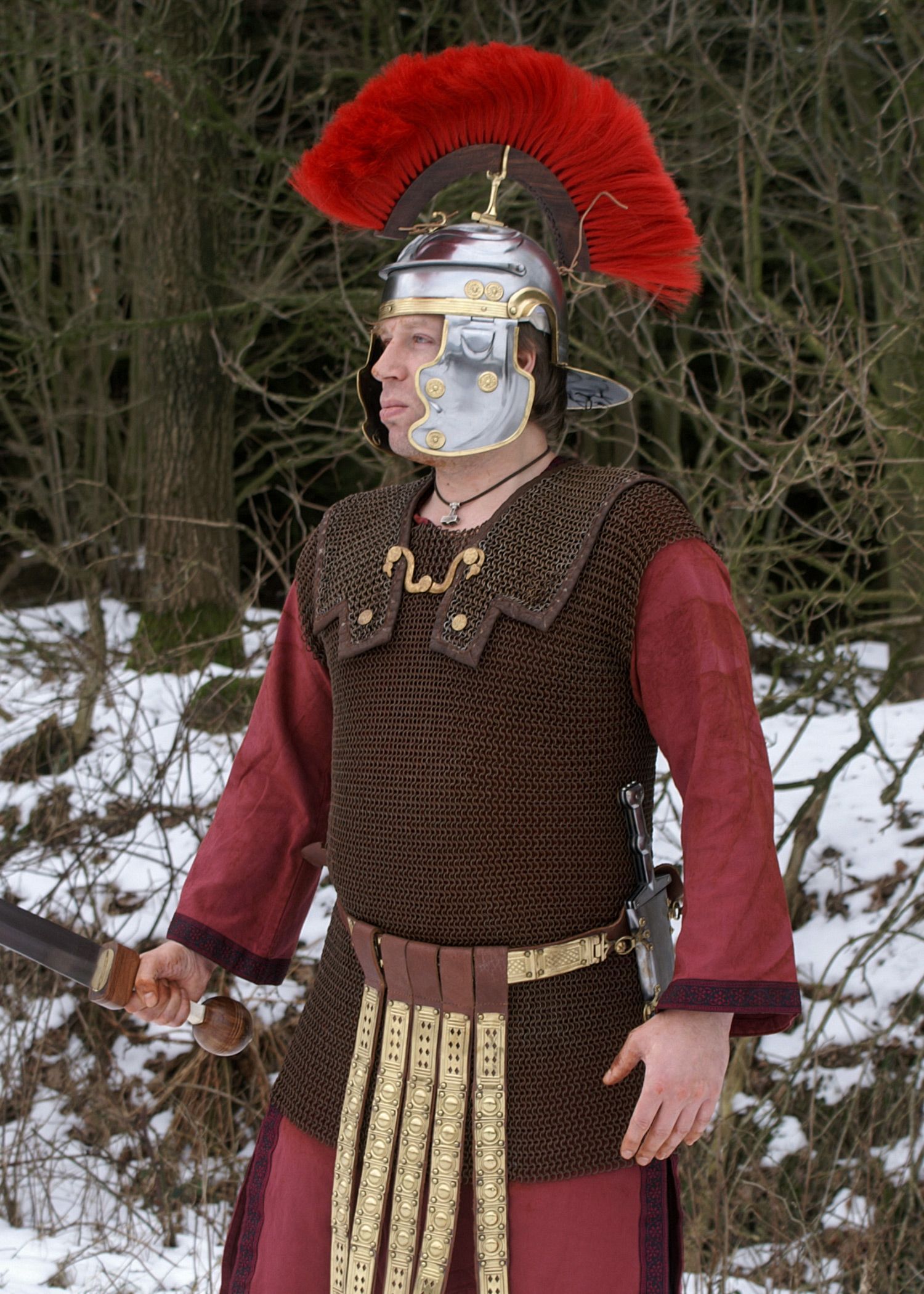 Lorica Hamata mit Schulterdopplung, ID 8mm Federstahl Die Lorica Hamata war das typische Kettenhemd des römischen Legionärs. Inklusive der abgebildeten Schulterdopplung (Kragenteil) aus dem gleichen Material mit authentischen Knöpfen und Haken aus Messing und Lederumrandung versehen. Das Leder ist v