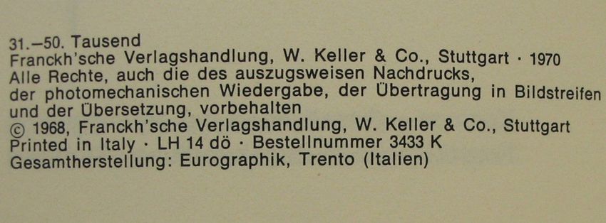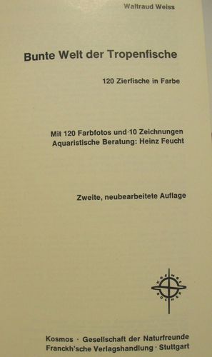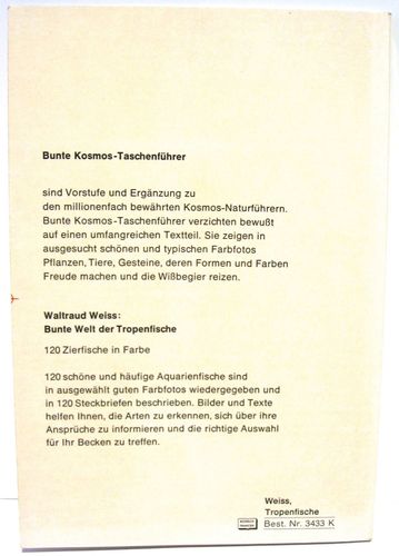 Buch Bunte Welt der Tropenfische 120 Zierfische in Farbe von Waltraud Weiss aus dem Jahr 1970 71 Seiten Format: ca. 13,3 cm x 19,5 cm x 0,5 cm Zustand: gebraucht, aber insgesamt noch gut erhalten Das Buch stammt aus dem Jahr 1970, altersbedingt sind daher Gebrauchs- und Lagerspuren vorhanden. Der Ei