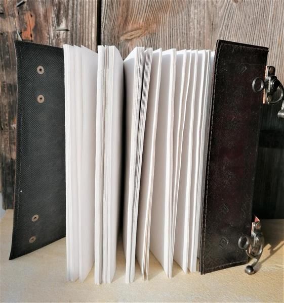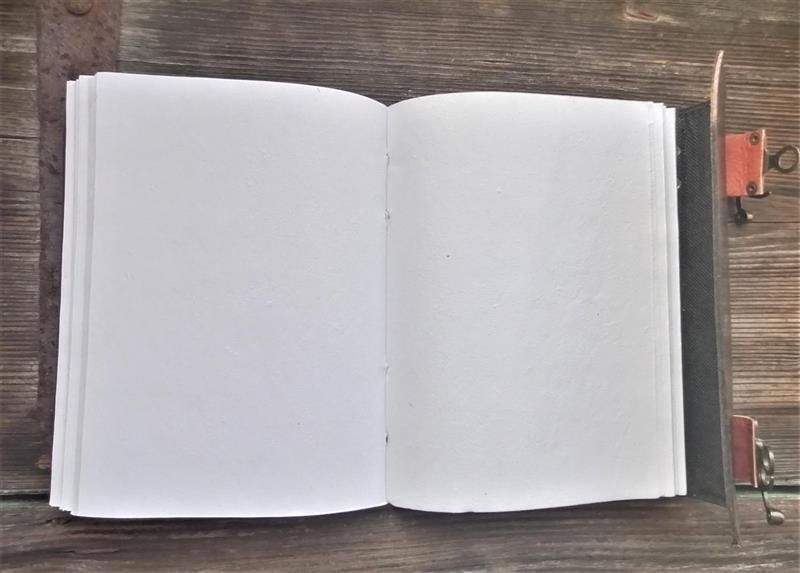 Buch der Schatten mit Ledereinband, eingeprägtem Pentagramm und Drachen. Das Buch wird mit Messingbeschlägen geschlossen. Die Seiten sind aus handgeschöpftem Papier (120 Seiten). Maße: 25 cm x 17,5 cm x 3,5 cm