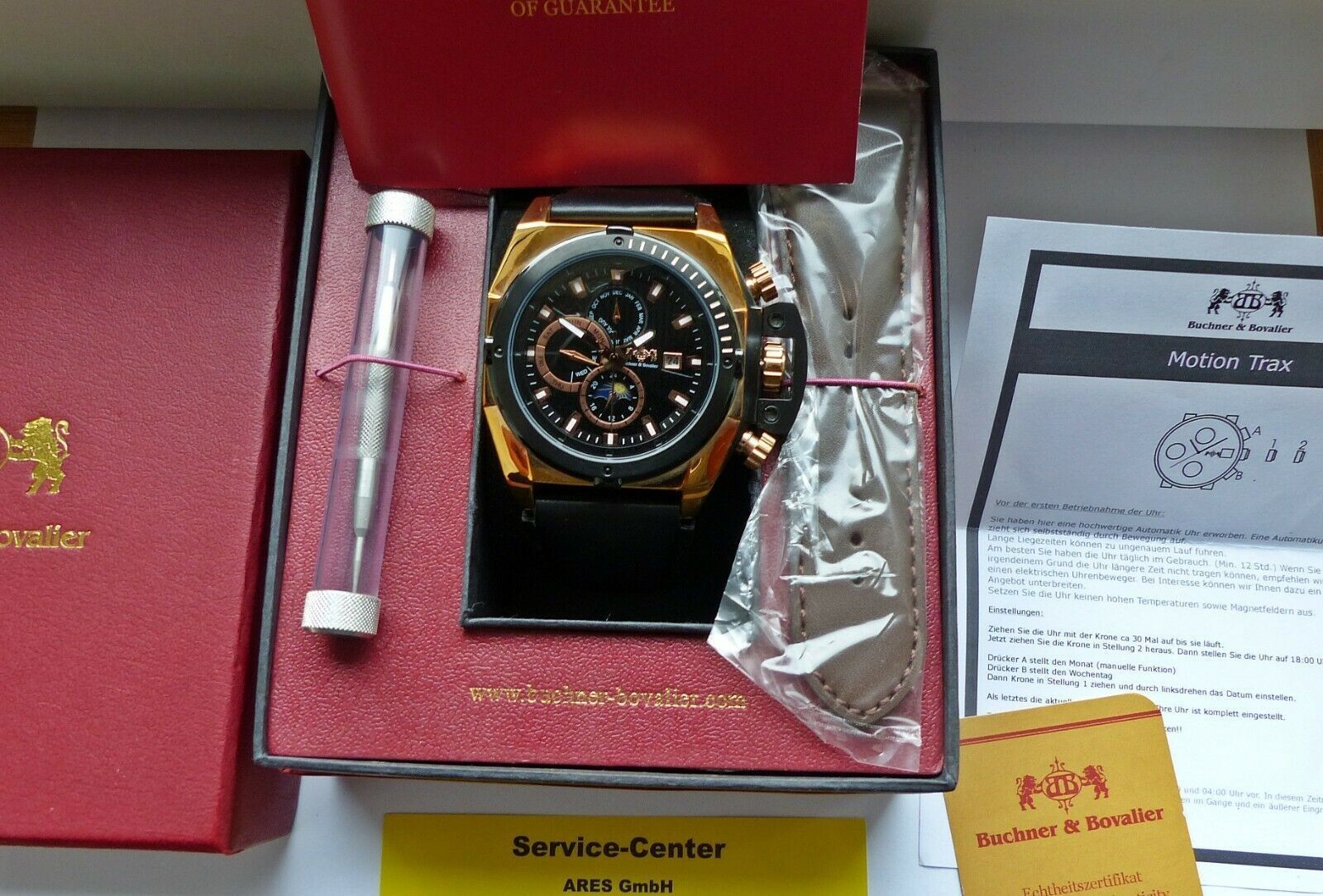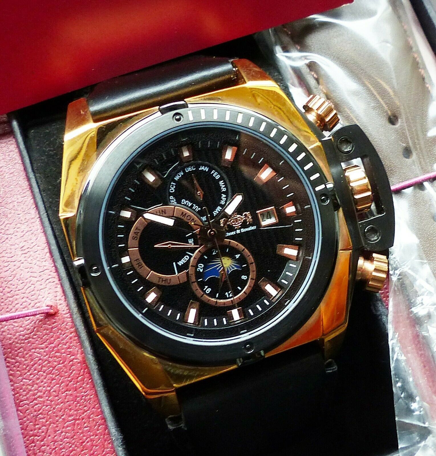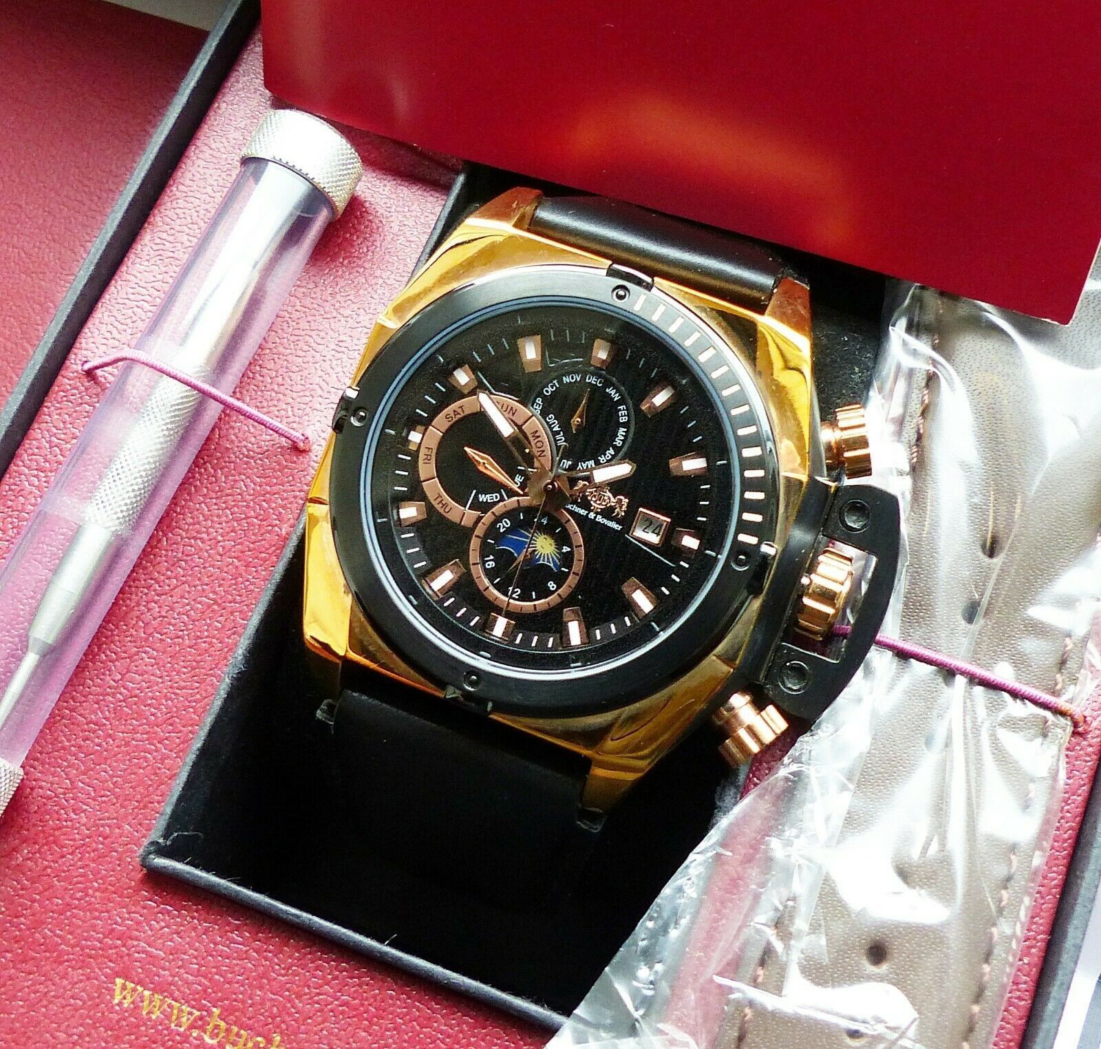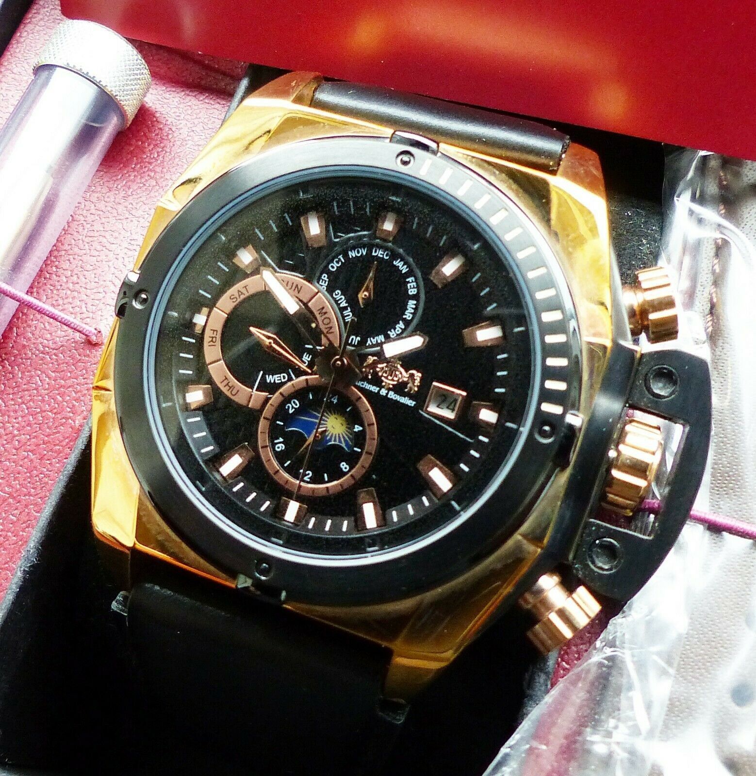 Hersteller : Buchner & Bovalier Deutschland Modell Sun & Moon Datograph Automatic mit Schwarzem Zifferblatt und Weiß-Goldenen Indexen, Datum, Monats, Tagesanzeige, Kronenschutz etc. Uhrwerk : Automatisch-Mechanisch mit 25Jewels Material Gehäuse : Komplett in Edelstahl vergoldet Durchmesser Gehäuse :