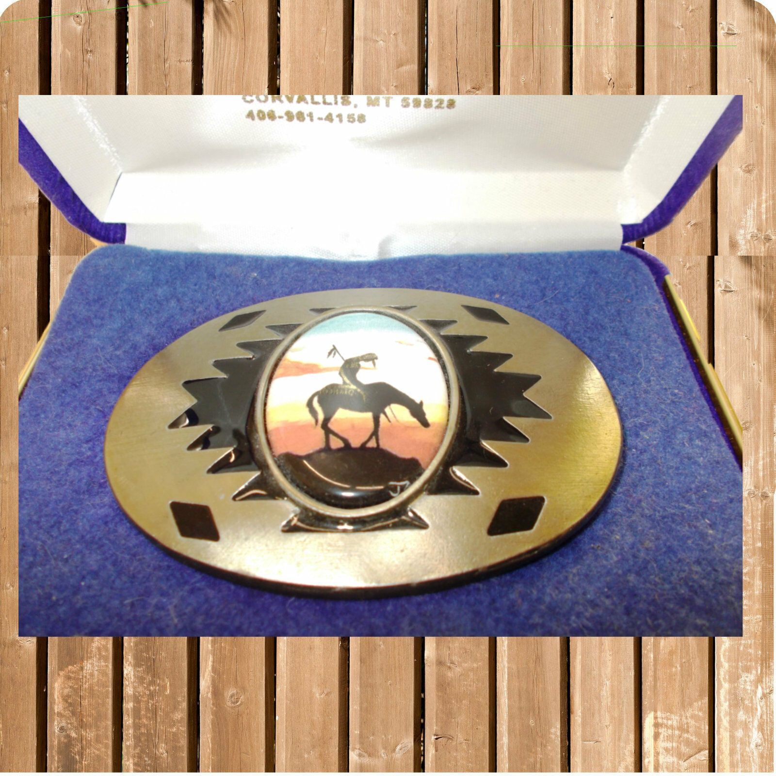 Western Buckle End of Trail Motiv End of Trail messingfarben Größe 8,5 x 6,5 cm wird in abgebildeter Schatulle geliefert