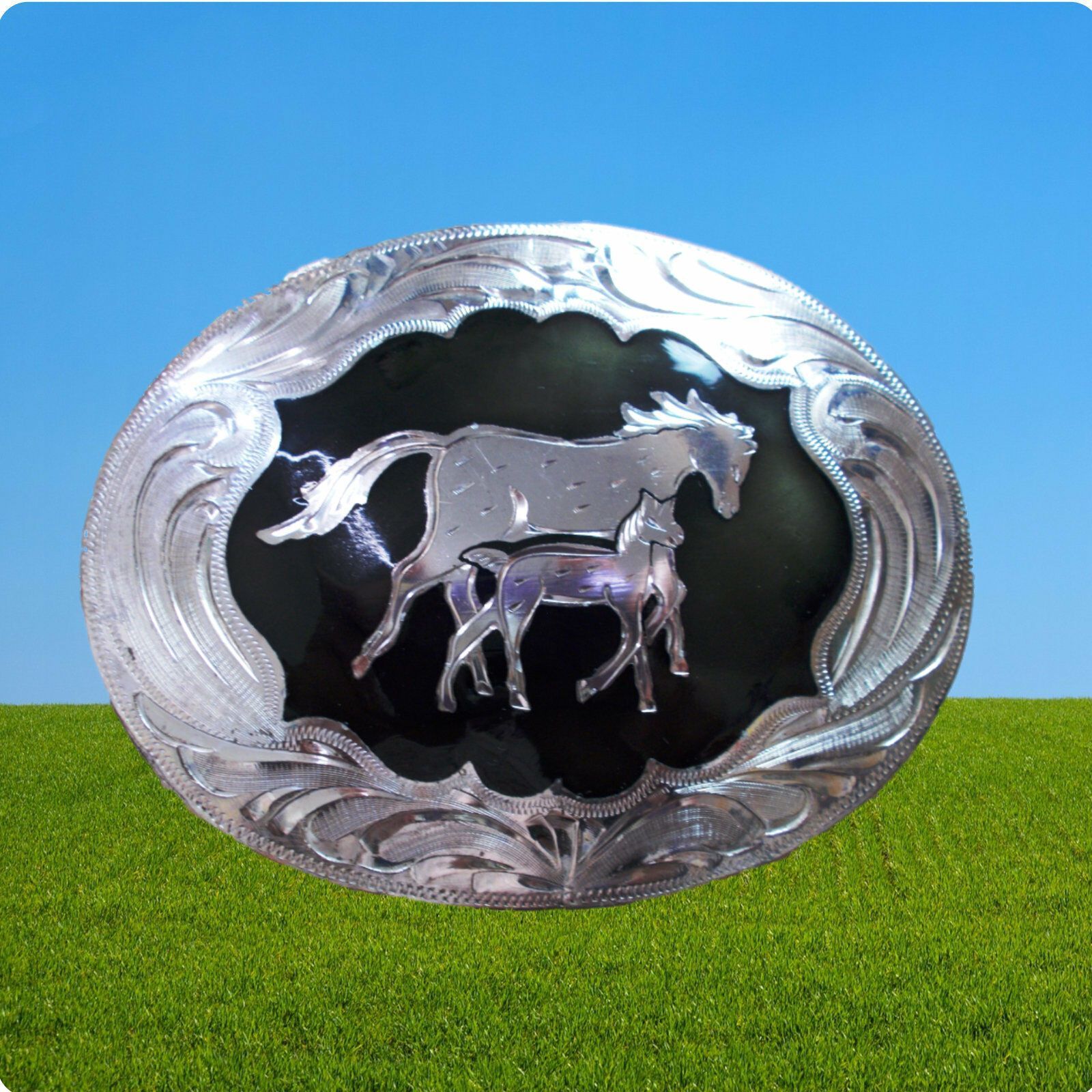 Western Buckle Stute mit Fohlen Motiv Stute mit Fohlen silberfarben mit schwarz Größe 11 x 8 cm Lieferung ohne Verpackung