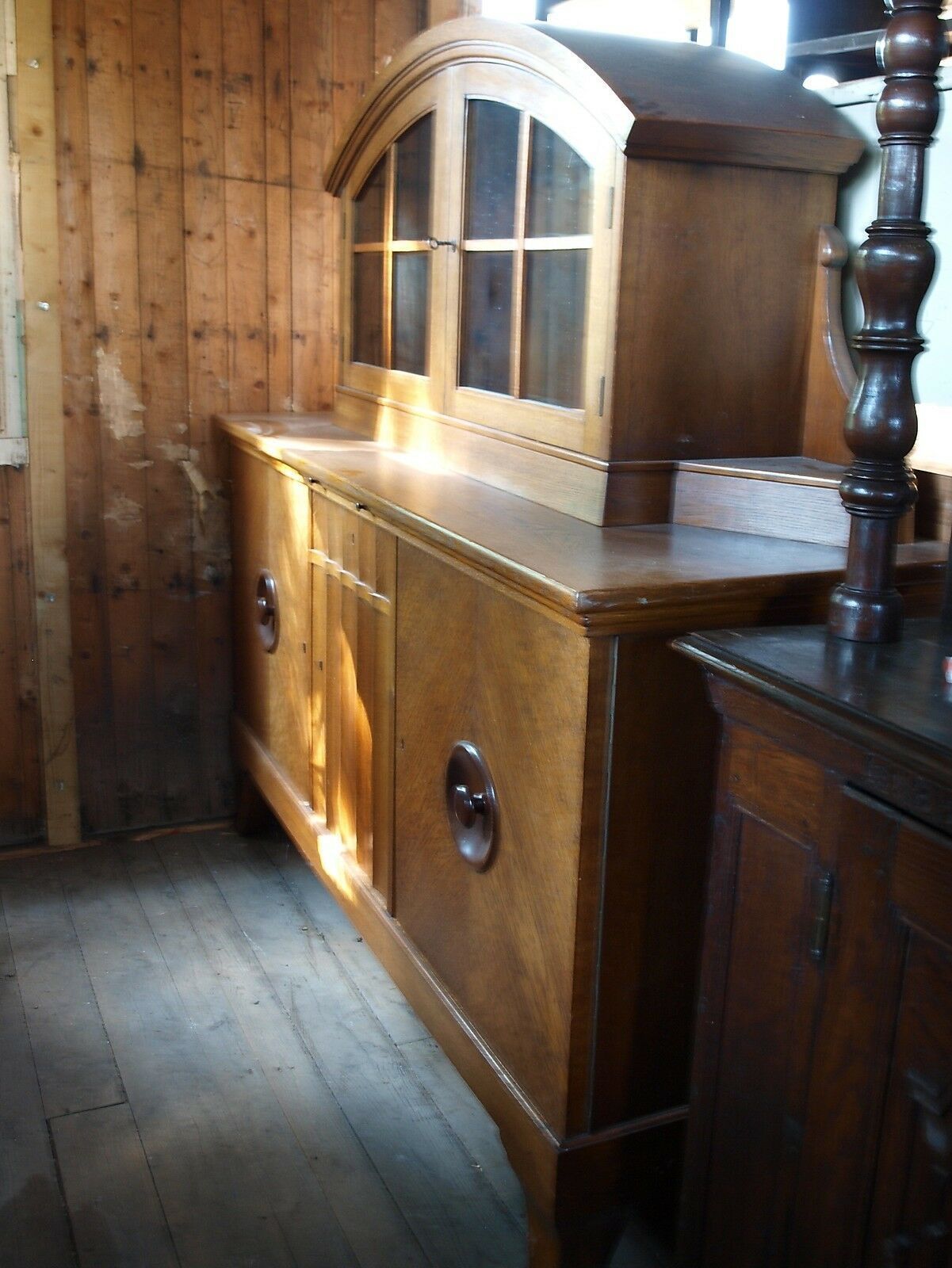 Anrichte Büffet um 1925, bestehend aus Ober- und Unterteil. Material: Eiche hell. Sehr guter Zustand! Maße: H 176, B 179, T 61, Innentiefe 29 bzw. 57 cm. Lieferung im Umkreis von 40 km frei Haus! Sonst Transport mit Spedition möglich (je nach Angebot und Entfernung!). Der angegebene Versandpreis bez