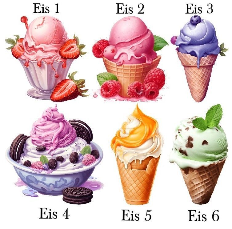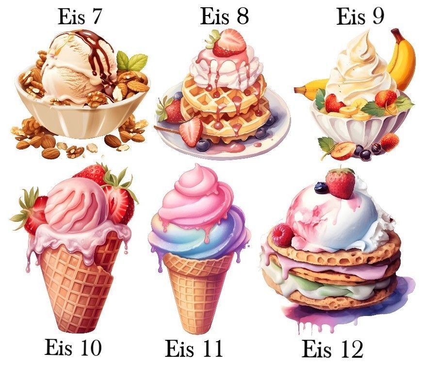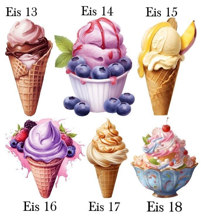 Eis 1, Eis 2, Eis 3, Eis 4, Eis 5, Eis 6, Eis 7, Eis 8, Eis 9, Eis 10, Eis 11, Eis 12, Eis 13, Eis 14, Eis 15, Eis 16, Eis 17 und Eis 18