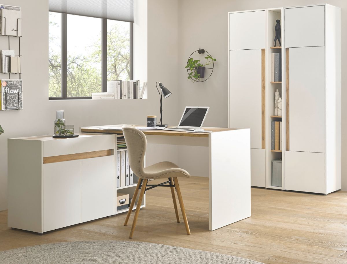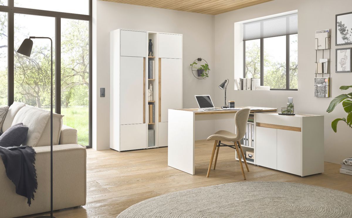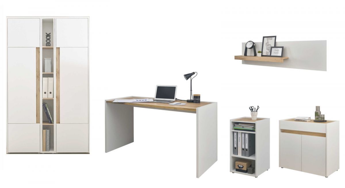 Büro Möbel komplett Set mit Aktenschrank Schreibtisch Kommode weiß und Eiche Center
